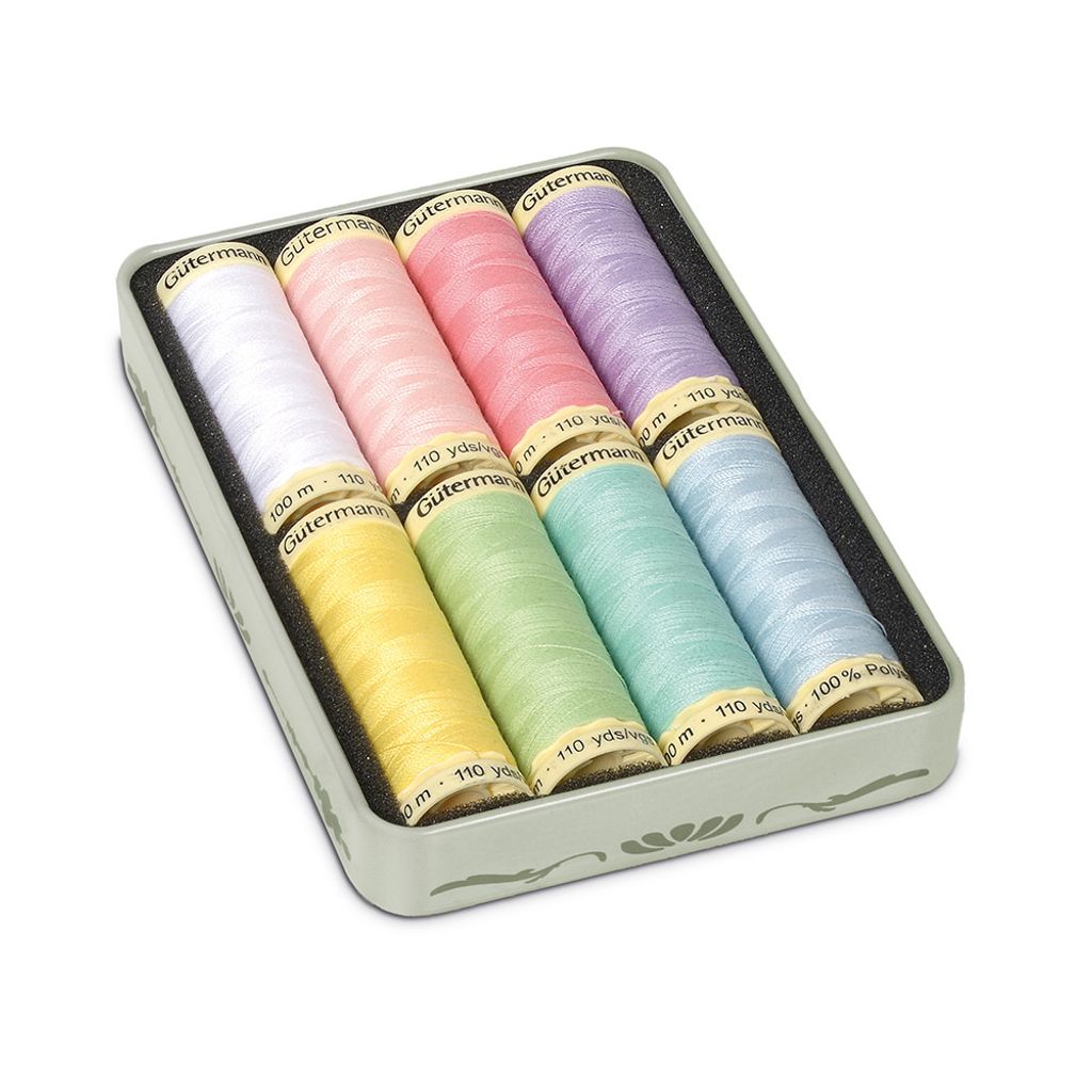 Boxen innehåller 8 trådrullar i pastellfärger.