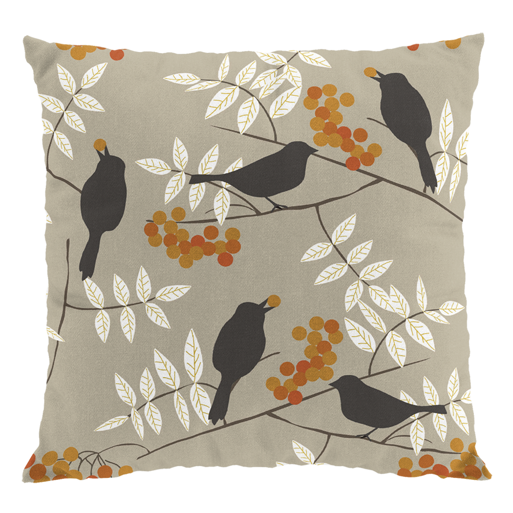 Ett mönster av trastar och blad i höstens tecken. Mönstret är tryckt på Arvidssons klassiska bomullsvara. Fodralet är 47x47cm med ett blixtlås i nederkant.