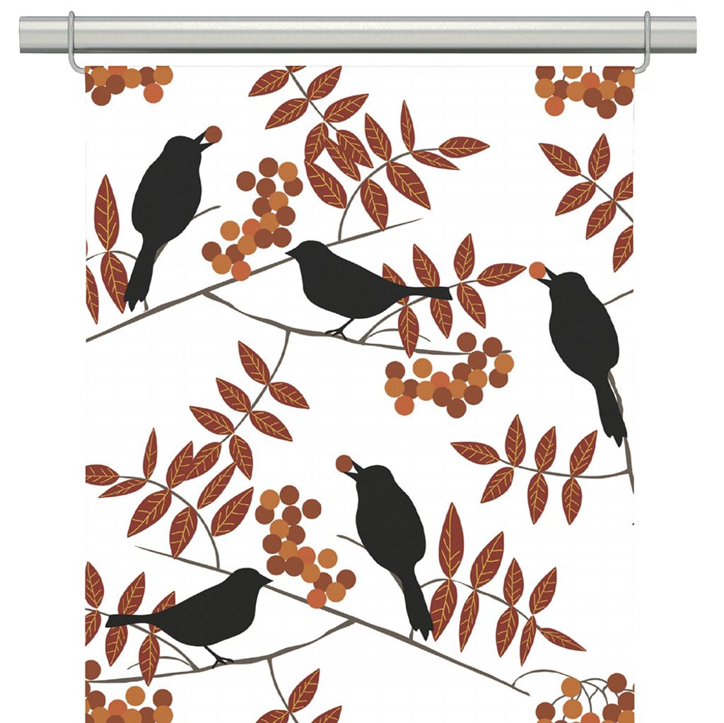 Trast i hast rost panelgardiner med mönster av fåglar, kvistar, blad och bär på en vit boten.
