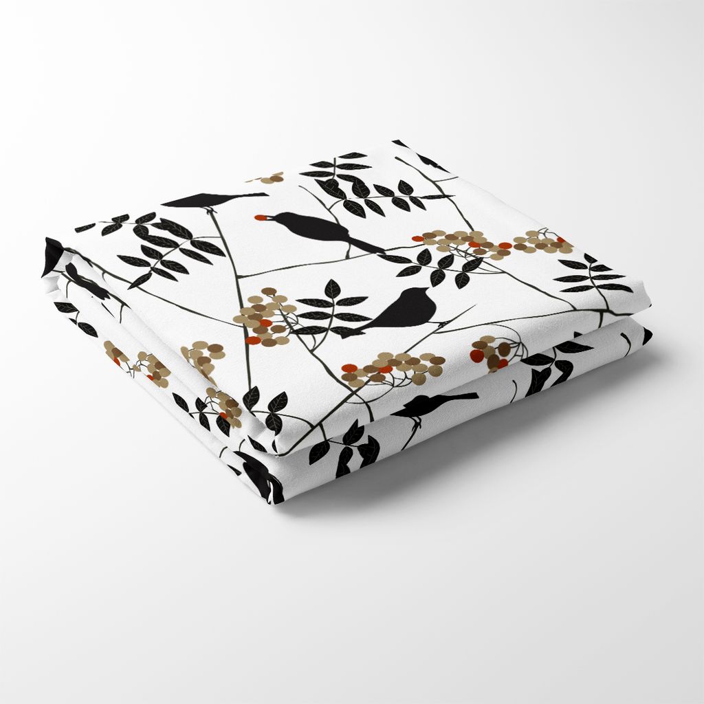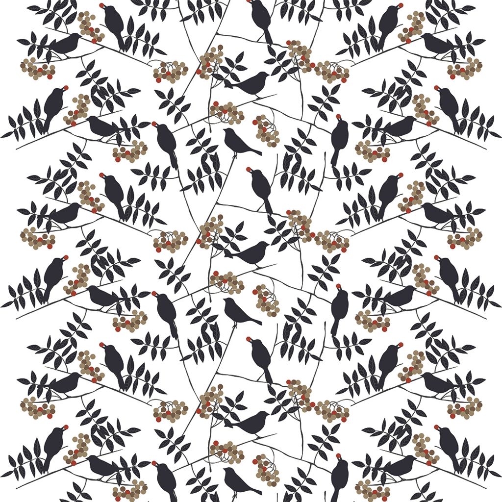 Bordsduken Trast i Hast med svarta fåglar och löv på en vit bakgrund, vilket skapar en tidlös kontrast.