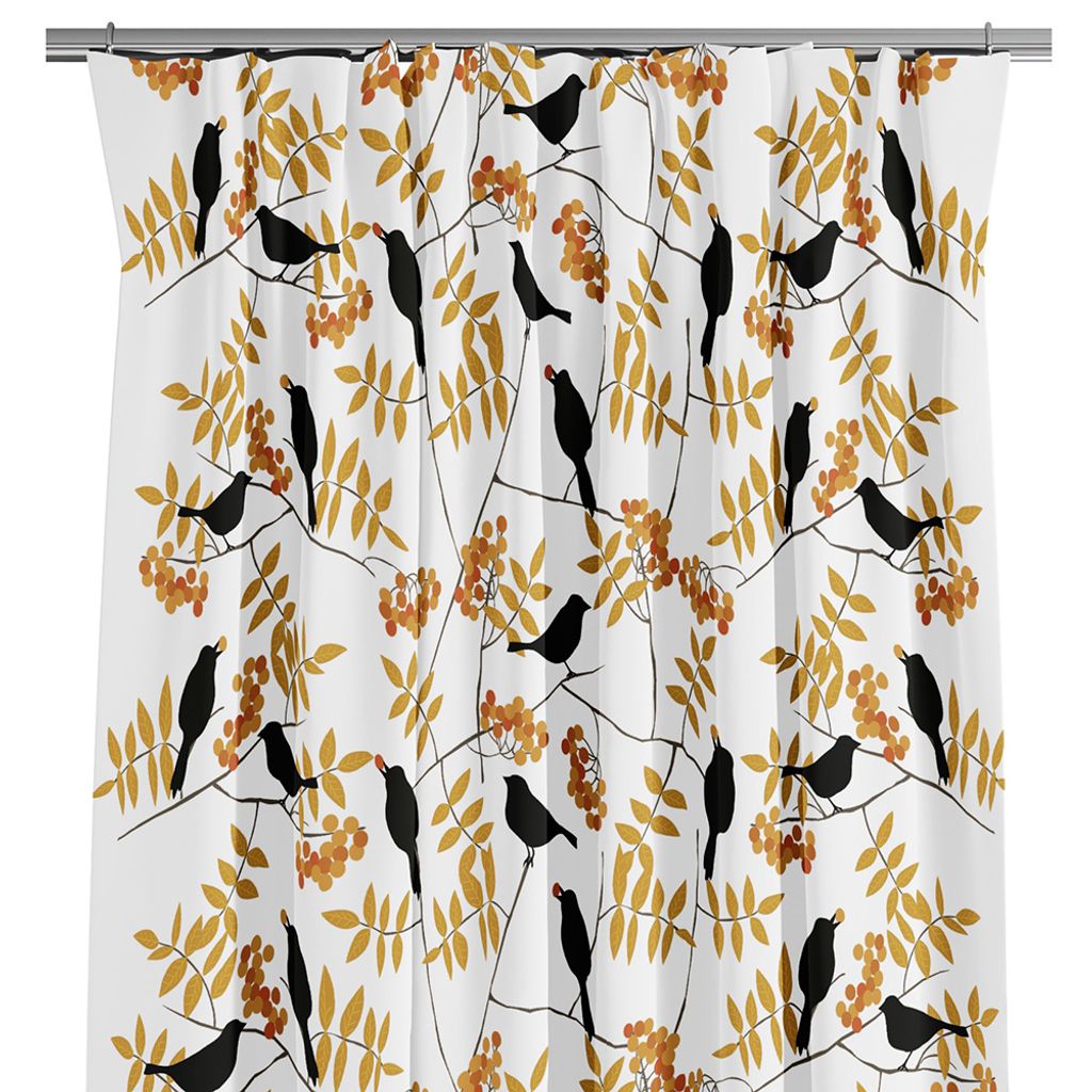 Gardiner med vit botten och svarta trastar, gula blad och orange bär.