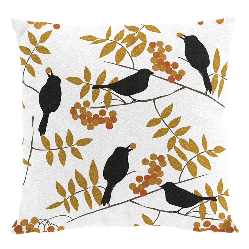 Ett mönster av trastar och blad i höstens tecken. Mönstret är tryckt på Arvidssons klassiska bomullsvara. Fodralet är 47x47cm med ett blixtlås i nederkant.