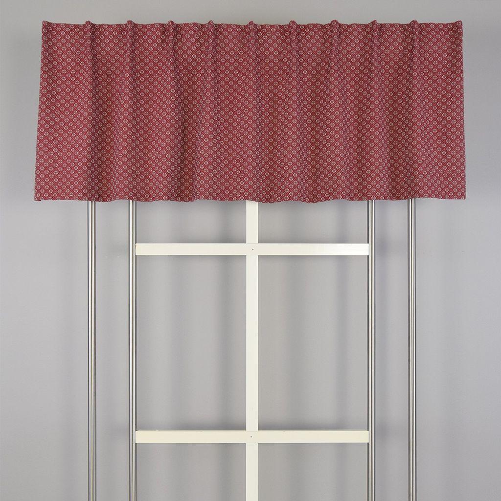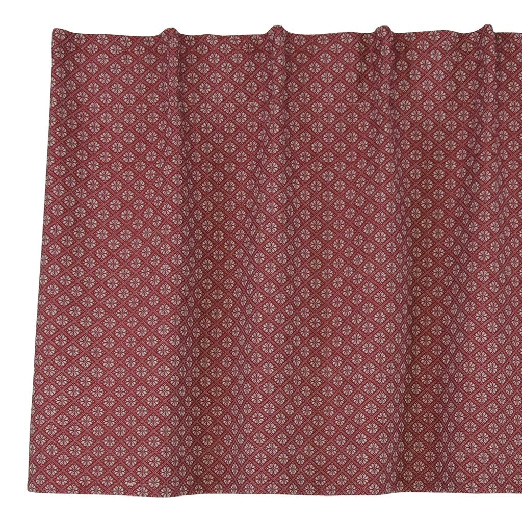 Gardinkappa med vävt bolsterliknande mönster i beige på en röd botten