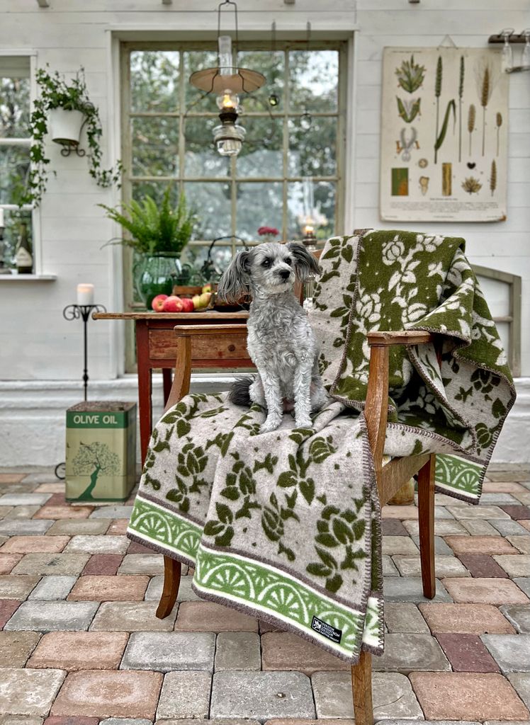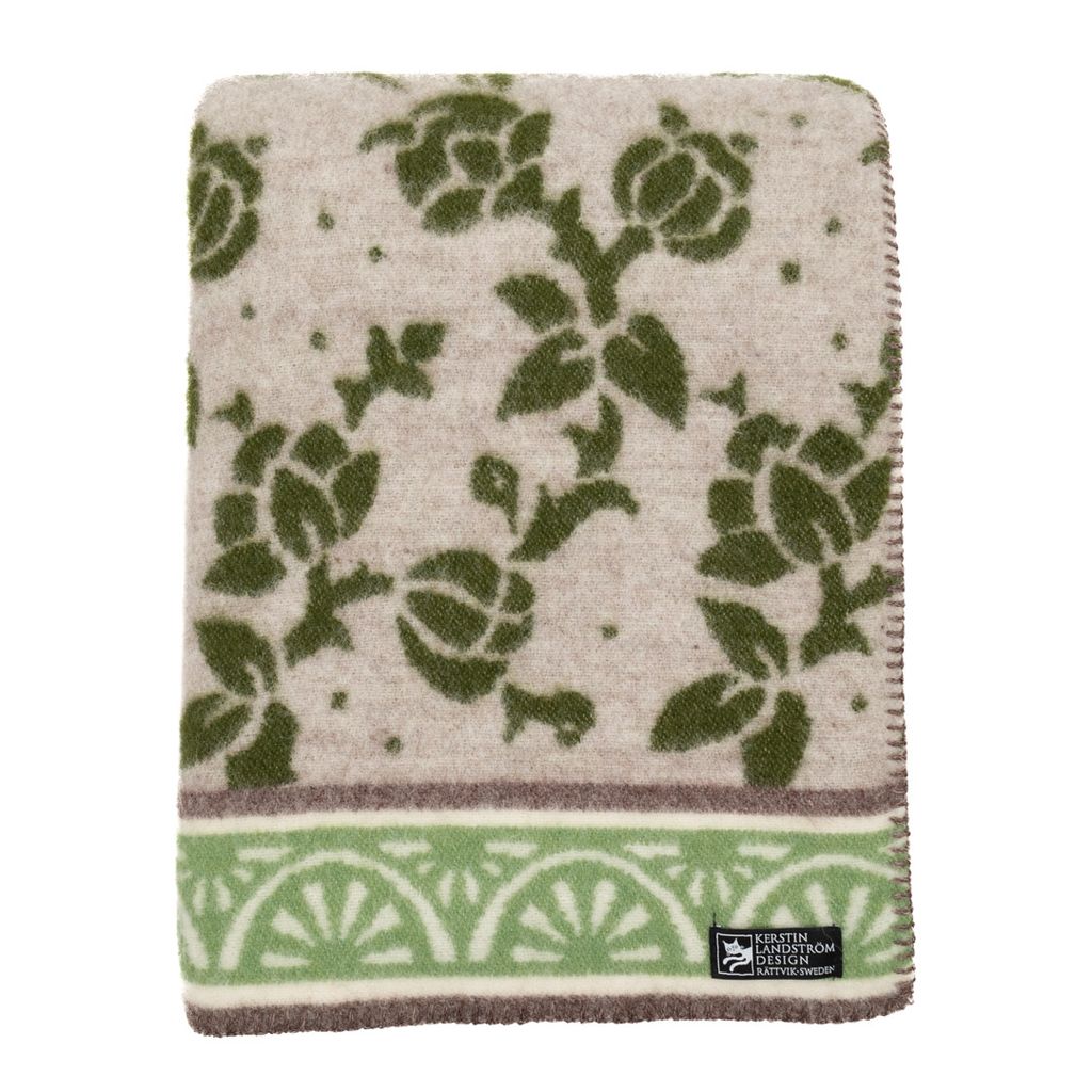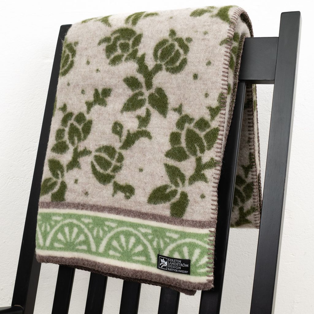 JUGEND Ullfilt grön har ett mönster som är inspirerat av en tapet från 1920-talet som finns på världsarvsgården Erik-Anders i Hälsingland.