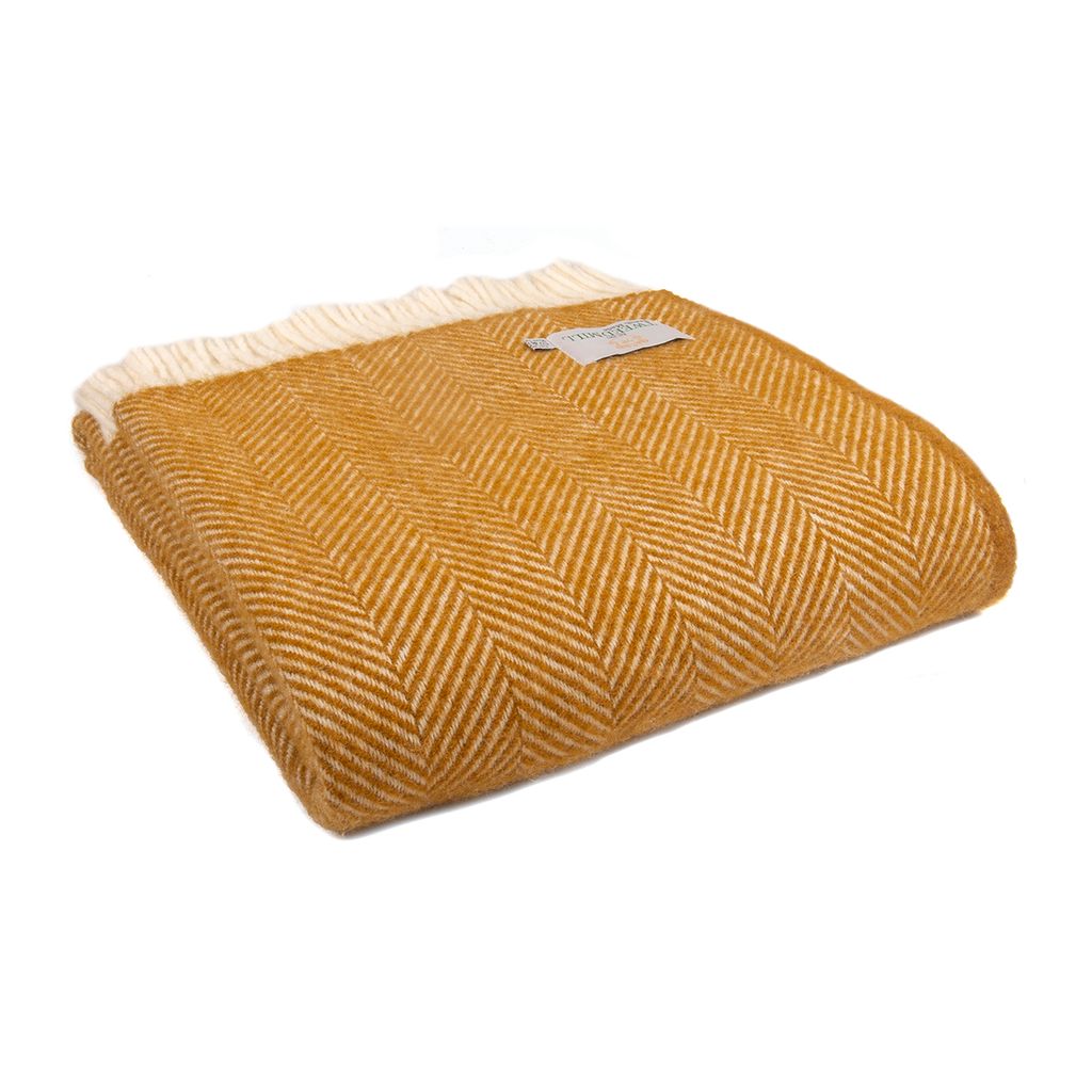 Mjuk och stilren ullpläd med fiskbensmönster i varma senapsgula nyanser. En tidlös filt som både värmer och tillför en livfull, elegant detalj i ditt hem.