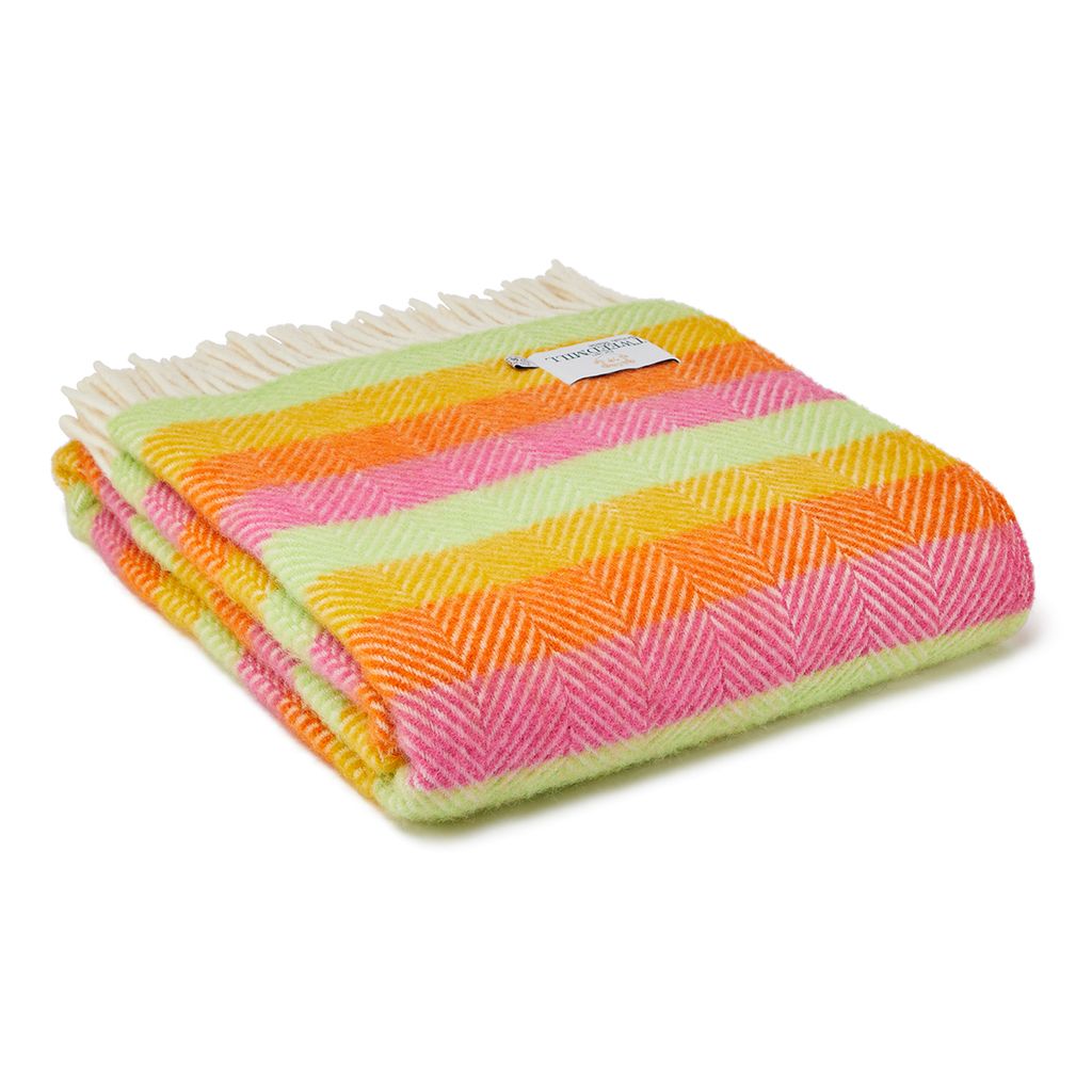 Mjuk och färgglad ullpläd med livliga ränder i nyanser av rosa, orange och limegrönt. En lekfull och mysig filt som både värmer och ger en pigg detalj i ditt hem.