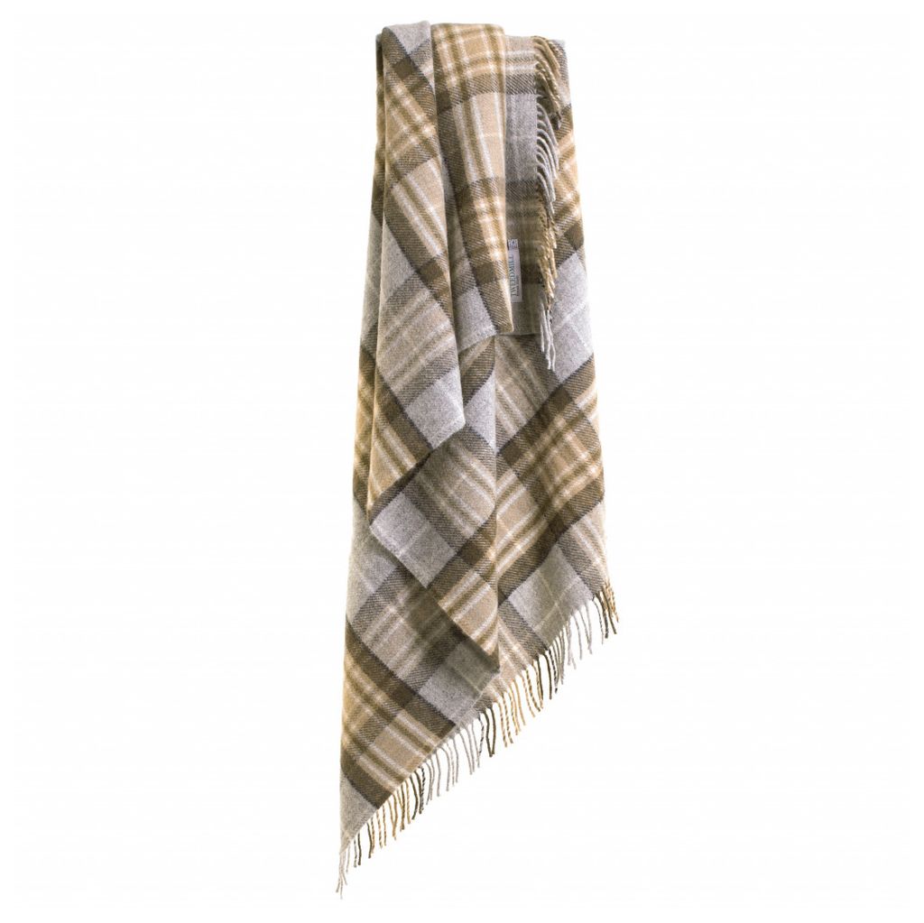 Tweedmill Ullfilt Tartan McKellar i 100% ull, med ett rutmönster i harmoniska toner av grå, beige, ockra och brunt. Storleken (150 x 183 cm) gör att du enkelt kan svepa in dig i mjuk värme eller använda filten som en stilfull dekoration i soffan, fåtöljen eller sängen.