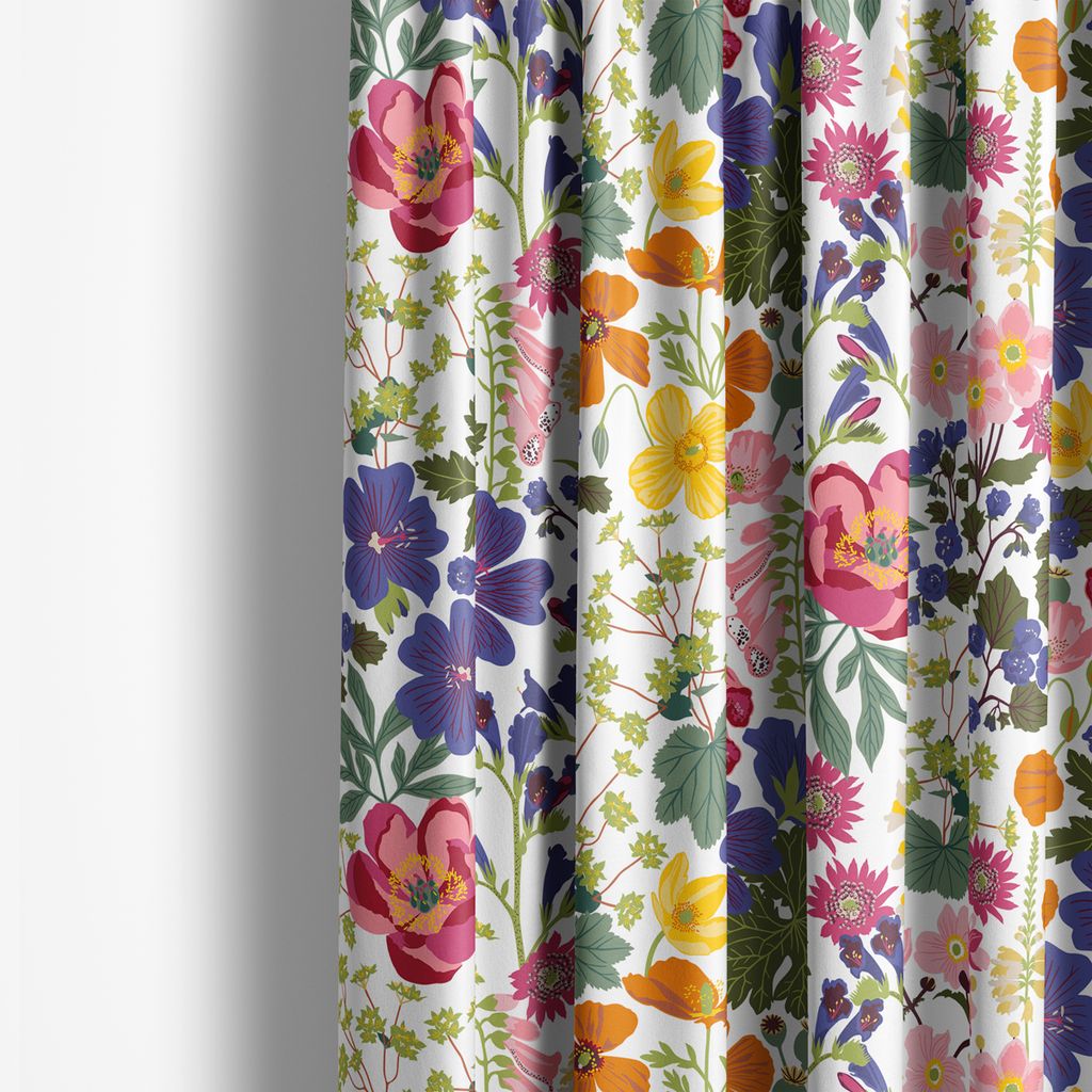 Mönstret är fyllt av blommor i nyanser av rött, gult, rosa, lila och blått, arrangerade på en ljus bakgrund som framhäver blomma och blad.