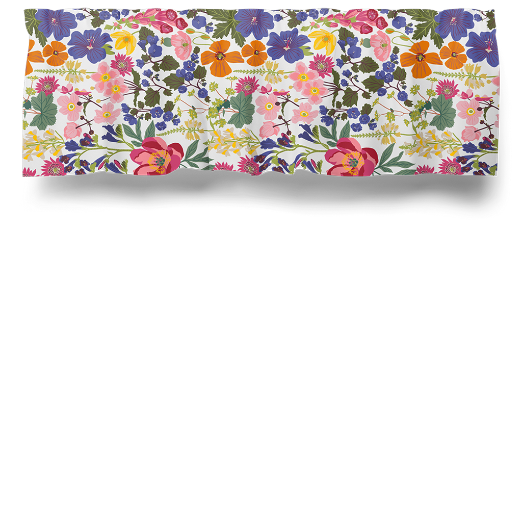 Gardinkappa på metervara med multiband och ofållade sidor. Ulvön är fylld med en mångfald av blommor i varma nyanser av rött, gult, rosa, lila och blått, på en ljus bakgrund som framhäver varje detalj. Kappan är 55cm hög.