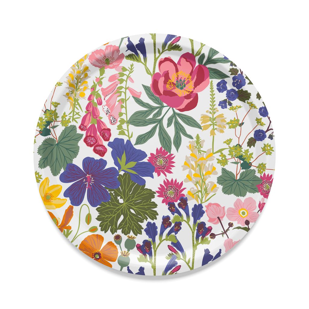 En rund bricka med ett färgsprakande motiv av sommarblommor. Perfekt för att skapa en somrig känsla vid servering, oavsett säsong.