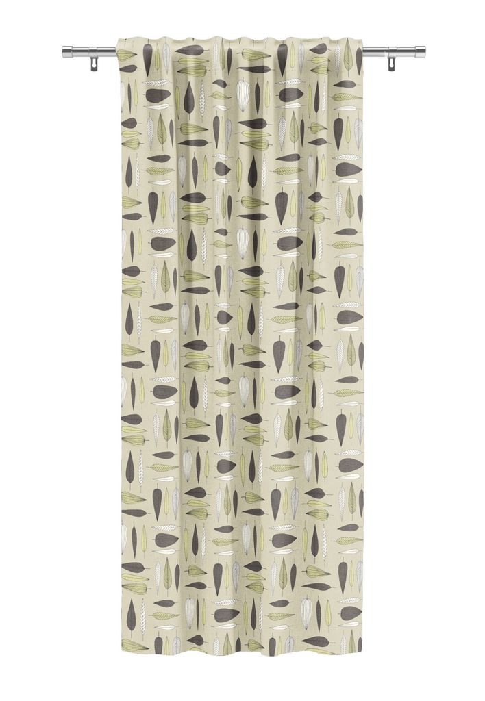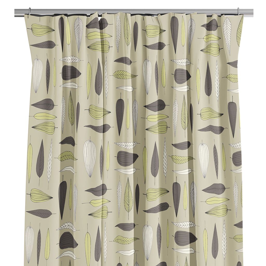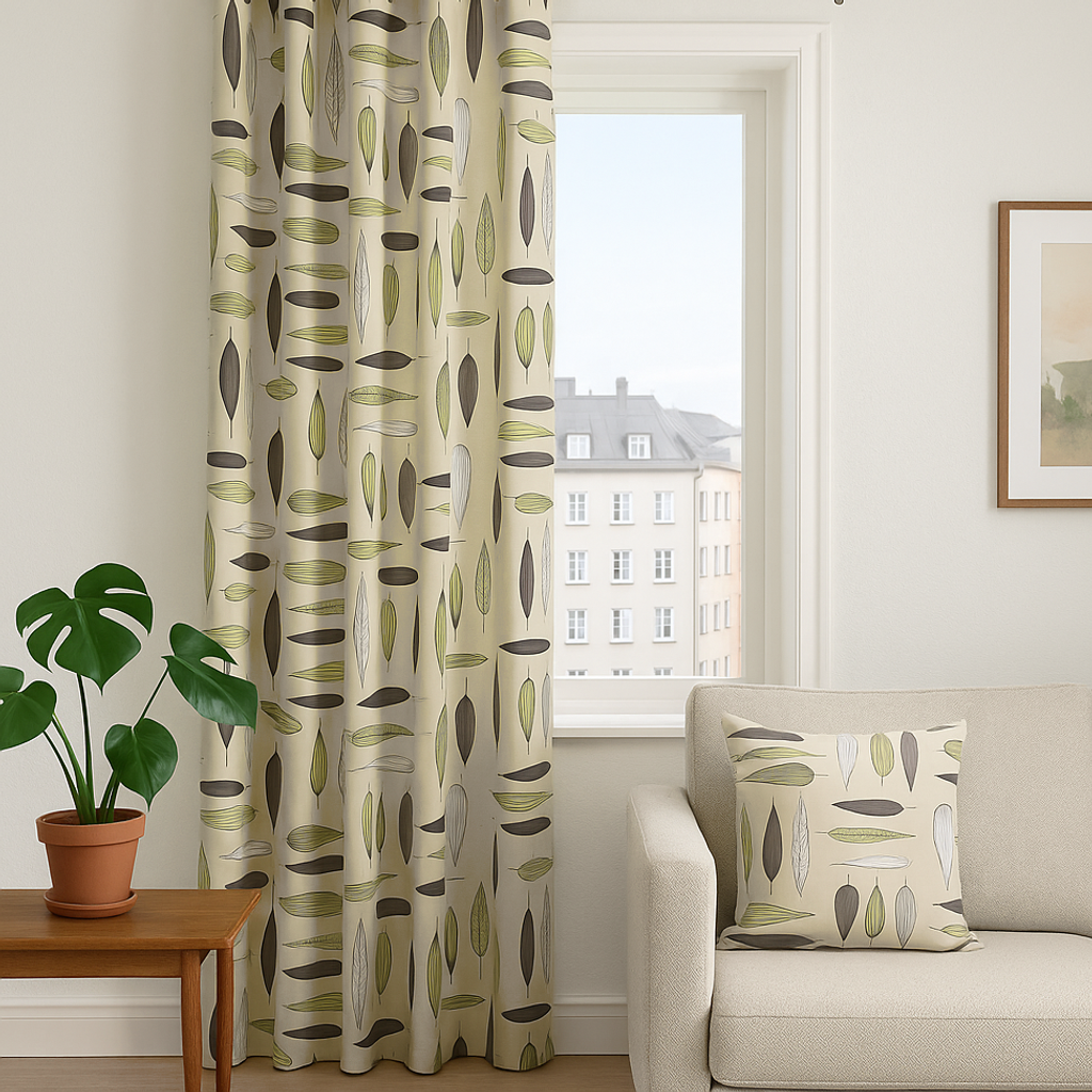 De olika formerna och riktningarna på bladen skapar liv i rummet utan att bli för dominant, vilket gör gardinen lätt att matcha med andra textilier och inredningsdetaljer.