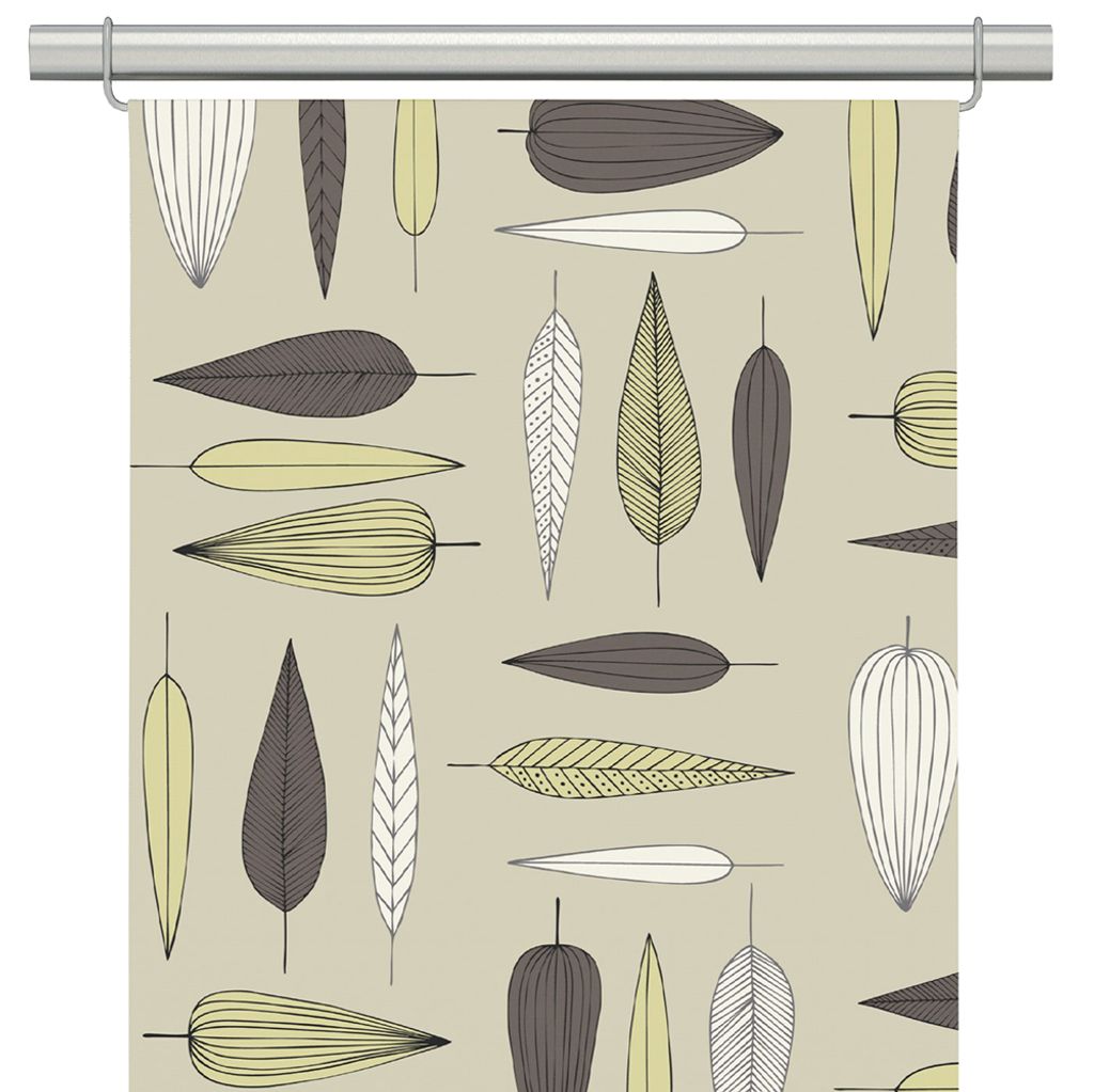 Två panelgardiner med ett stilrent och retroinspirerat bladmönster i dova färgtoner som svart, brunt, olivgrönt och offwhite – tryckt på en varm beige bakgrund. Ett tidlöst tyg som passar utmärkt för dig som vill skapa en lugn och harmonisk känsla i rummet.
