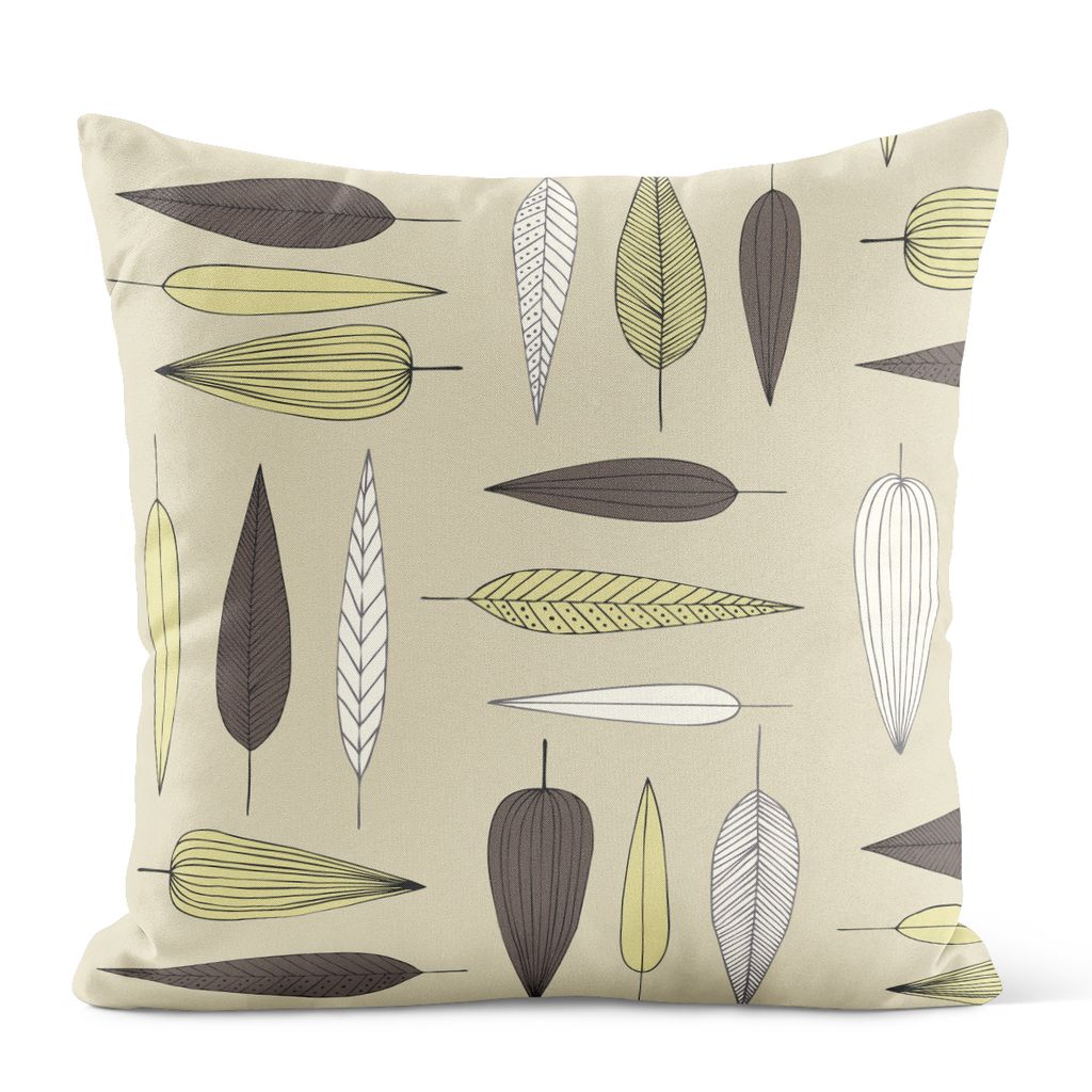 Beige kuddfodral i retrostil med grafiskt bladmotiv.