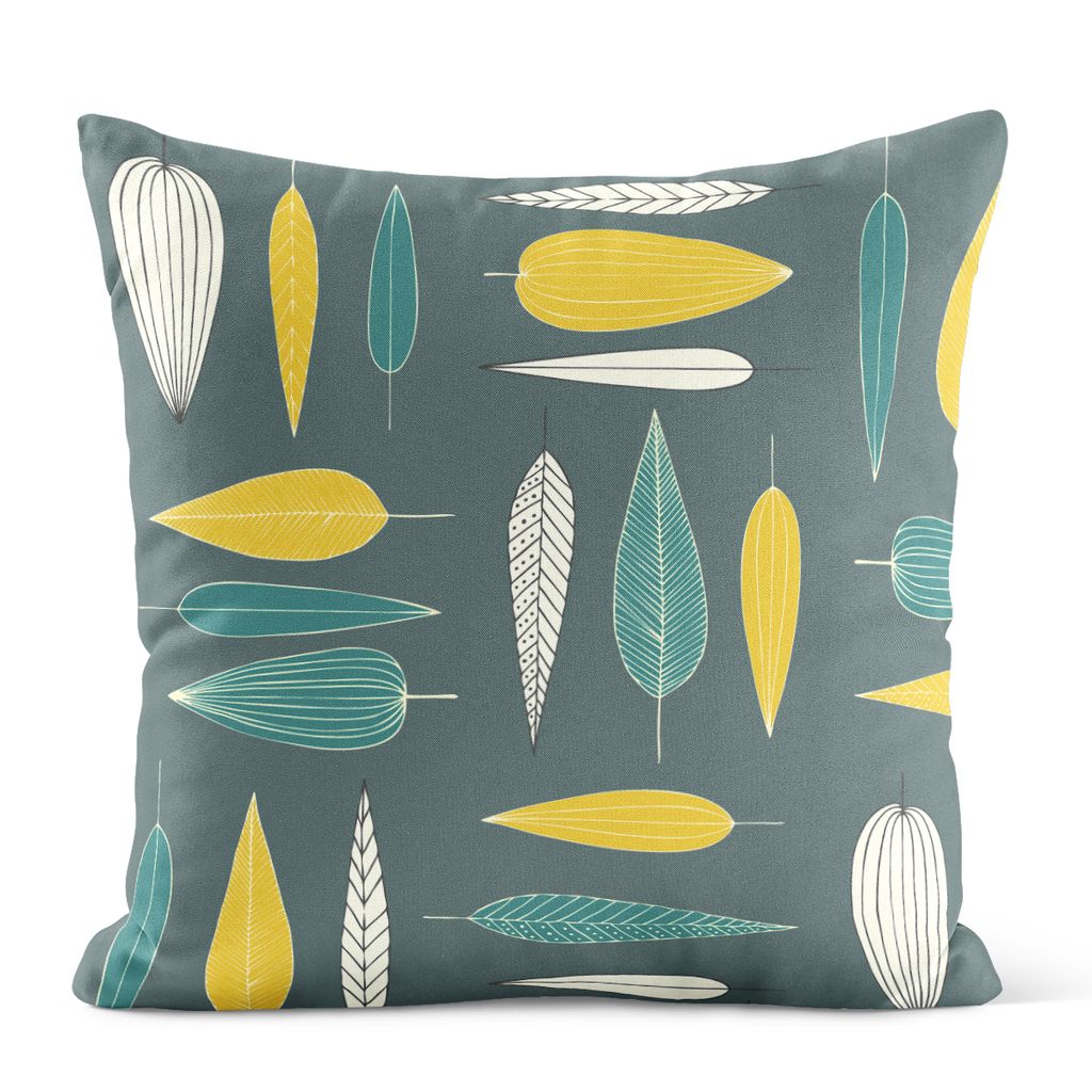 Kuddfodral i turkos bomull med blad i retrostil. Design Ulla Gustavsson för Arvidssons Textil – 47×47 cm.