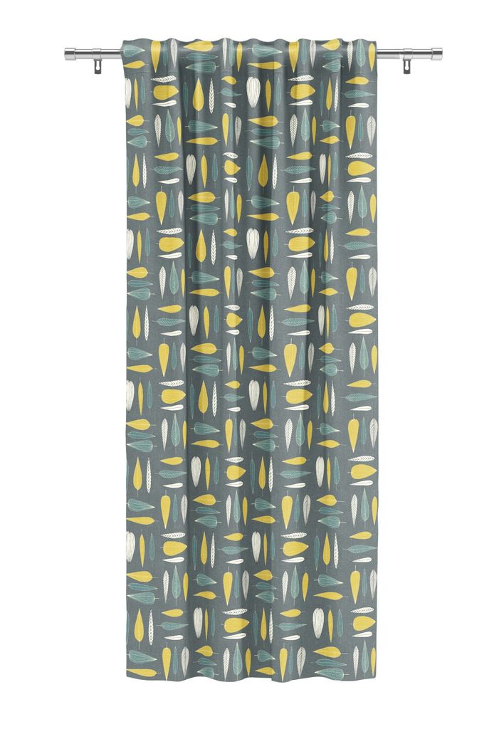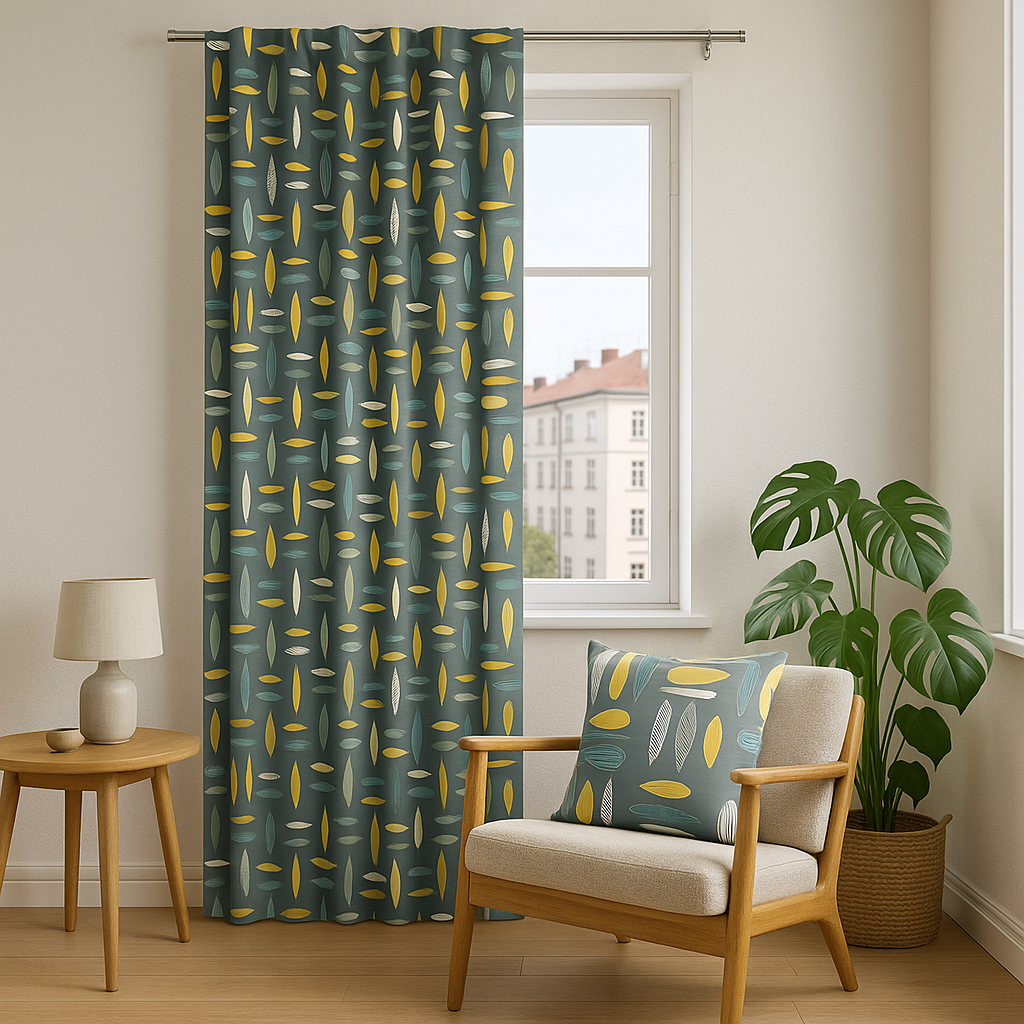 En stilren gardin i retroinspirerad design med bladmotiv i turkosa, gula och benvita toner. “Under trädet – Turkos” skapar en färgstark men harmonisk känsla i hemmet och passar perfekt för både moderna och klassiska miljöer.