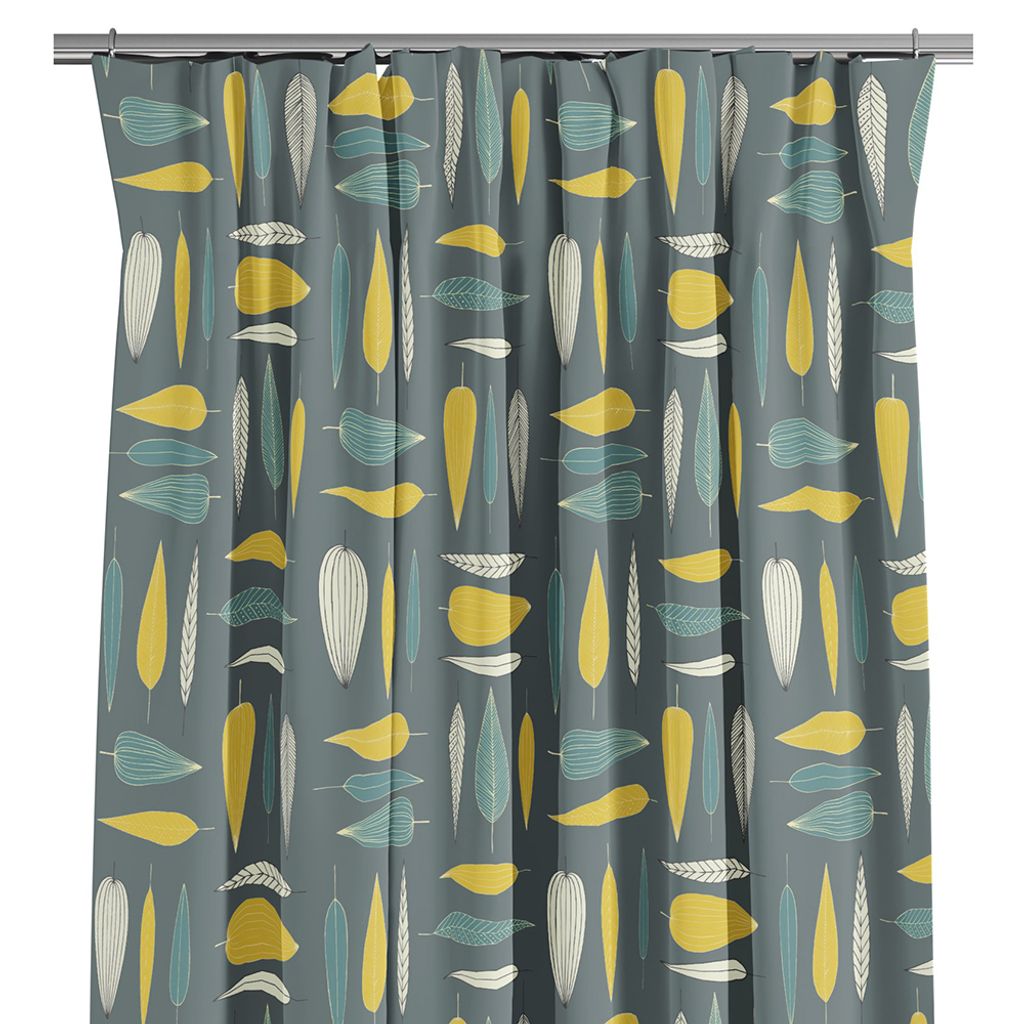 Under trädet – Turkos är en elegant gardin med ett lekfullt bladmotiv som för tankarna till skandinavisk design från 50- och 60-talet. Den dova gråblå bakgrunden ger en lugn bas som låter de turkosa och senapsgula bladen lysa upp rummet utan att bli överväldigande. De stiliserade bladen i olika former och strukturer ger ett vackert, organiskt uttryck som tillför liv till rummet.
