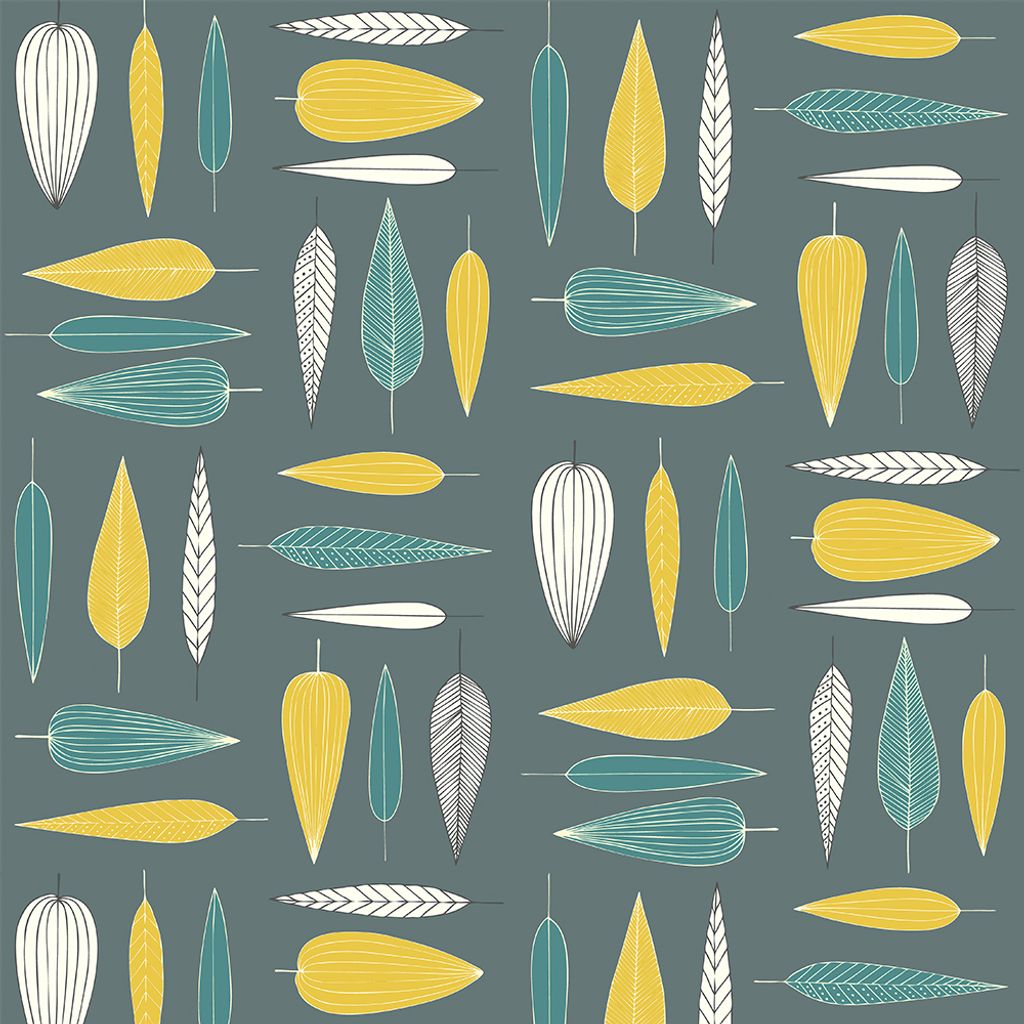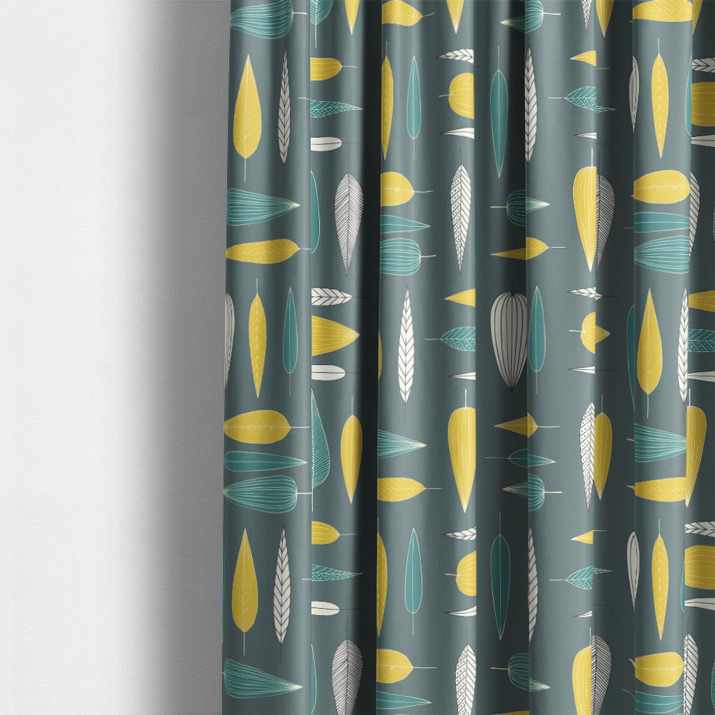 Metervara i bomull med stiliserade löv i blå och gröna toner på turkos botten. Design av Ulla Gustavsson . Passar perfekt till gardiner eller kuddar.