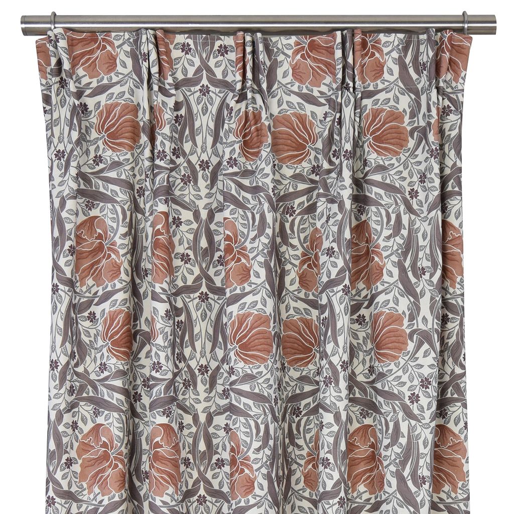 Vackra gardiner med Morris inspirerat mönster med stora blommor och snirkligt mönster i rost och grått.