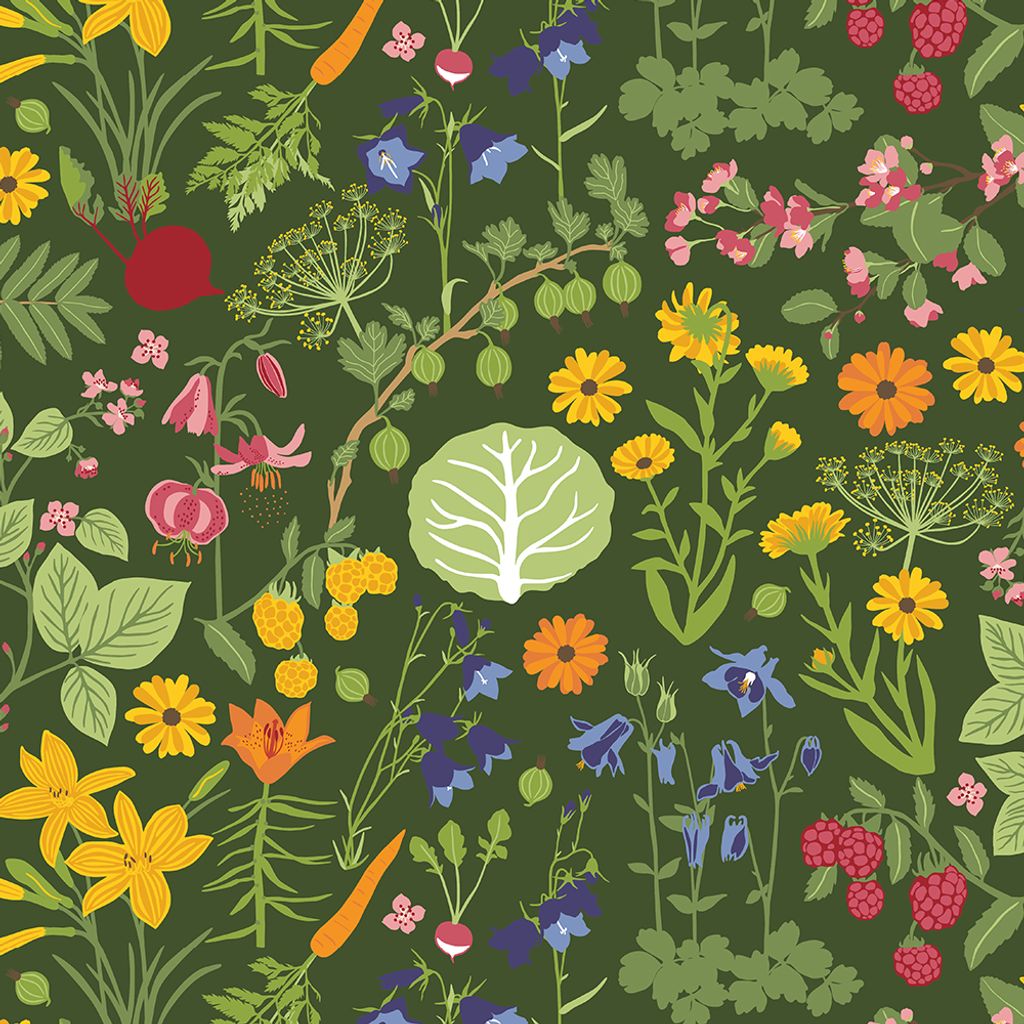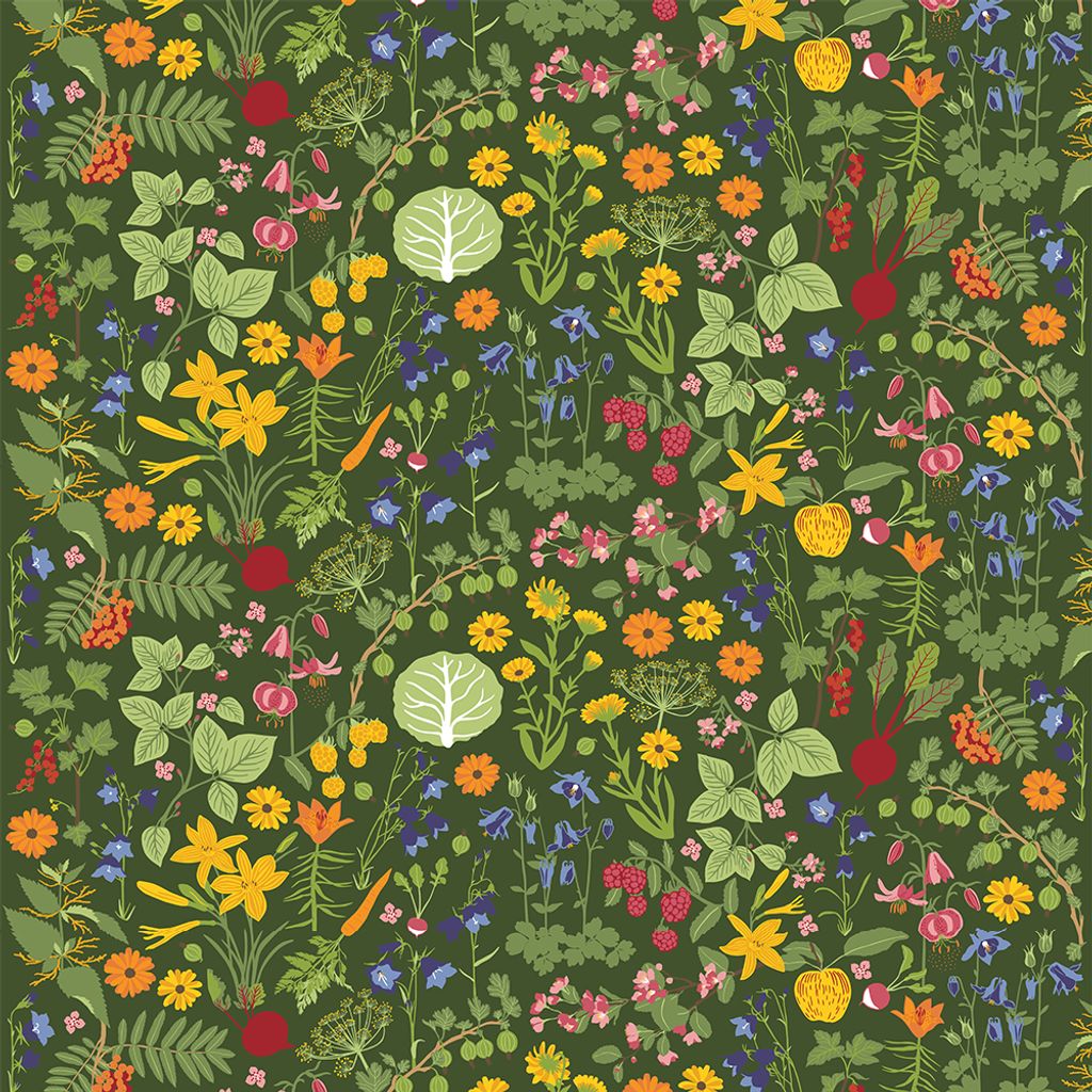 Detta är ingen vanlig vaxduk det är original tyget Hedemora grön från Arvidssons textil som är vaxbelagt, en så kallad CTC- väv. Tyget går att torka av med fuktig trasa och ev. lite diskmedel. Vi skickar tyget ihopvikt! Färgglatt mönster med grön botten och blommor, grönsaker och bär, designat av Edholm Ullenius.
