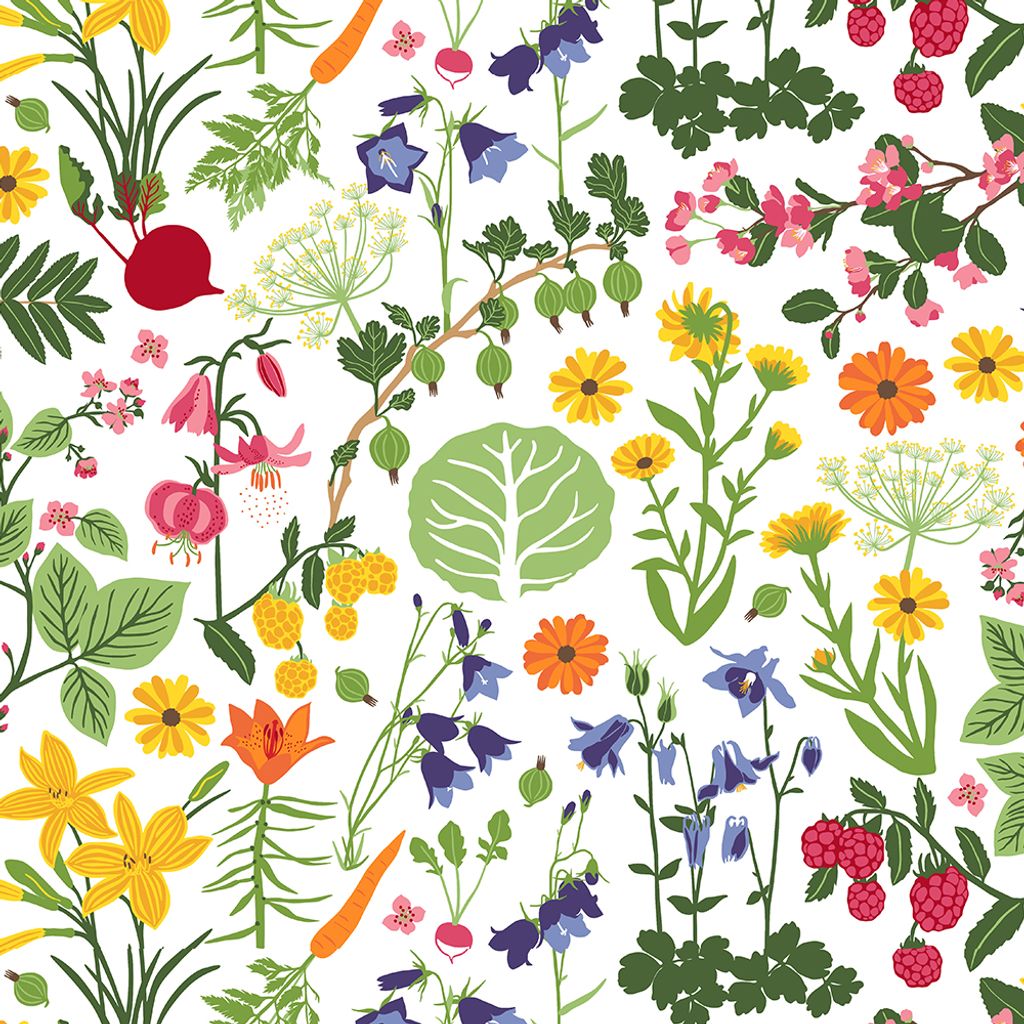 Detta är ingen vanlig vaxduk det är original tyget Hedemora vit från Arvidssons textil som är vaxbelagt en så kallad CTC- väv. Tyget går att torka av med fuktig trasa och ev. lite diskmedel. Vi skickar tyget ihopvikt! Färgglatt sommarmönster på vit botten med blommor, grönsaker och bär, designat av Edholm Ullenius.