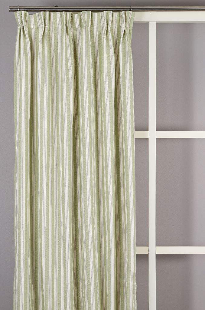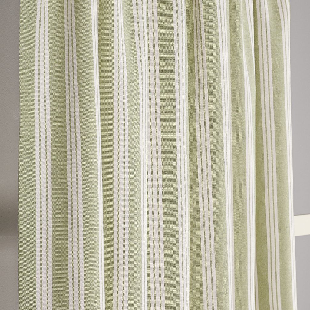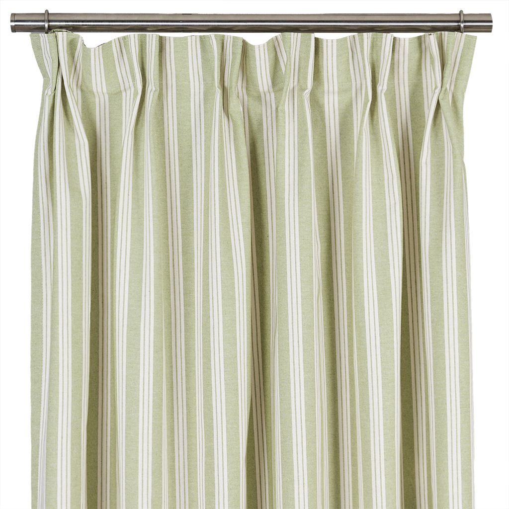 Vegani grön är en klassisk gardin med smala vita ränder på dämpad grön botten. Ett stilrent tyg som skapar en harmonisk och lantlig känsla i hemmet.
