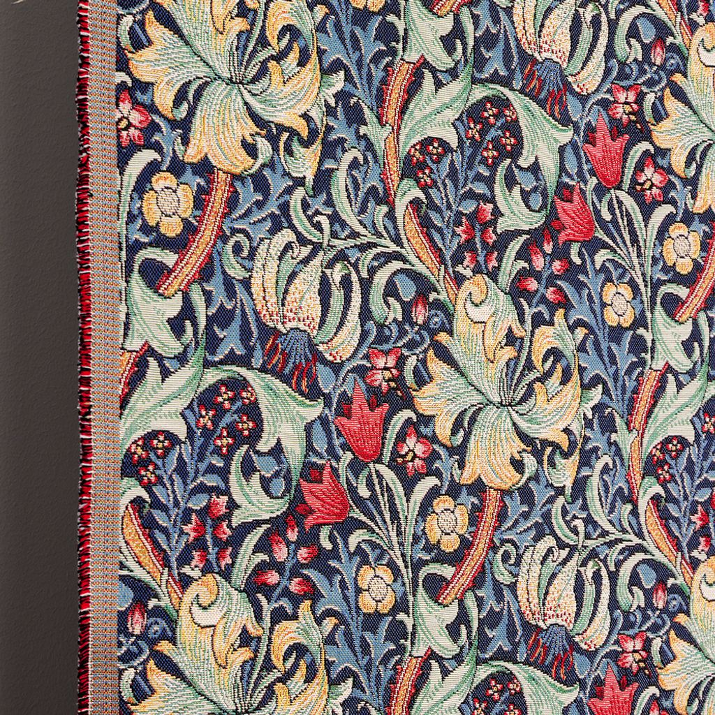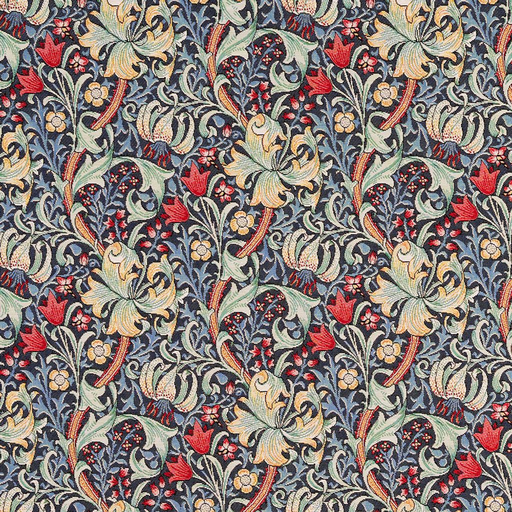 Verdelis mörkblå gobeläng är ett exklusivt möbeltyg med ett detaljerat, ornamentalt blommönster i djupt mörkblå botten kombinerat med nyanser av rött, grönt, beige och gult. Mönstret har ett klassiskt uttryck med tydliga historiska influenser och passar utmärkt i både traditionella och mer personliga, eklektiska miljöer.