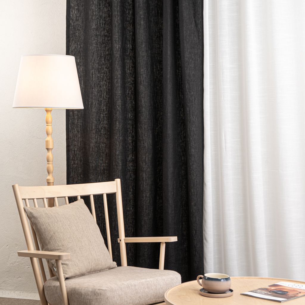 Verone Linne Svart. Härligt linnetyg i 100 % lin. Tyget är mjukt och följsamt, med en naturlig struktur. Perfekt för gardiner, dukar, kuddar och andra heminredningsprojekt där du vill skapa en inbjudande känsla. Med en slitstyrka på 22 000 Martindale är tyget tåligt och lämpar sig väl för möbelöverdrag och andra ytor med måttligt slitage.