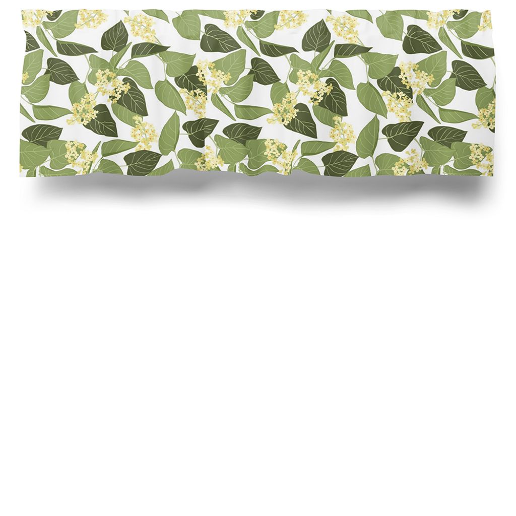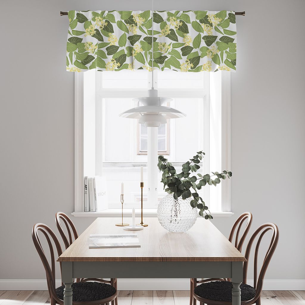 En gardinkappa med gröna blad och gula blommor