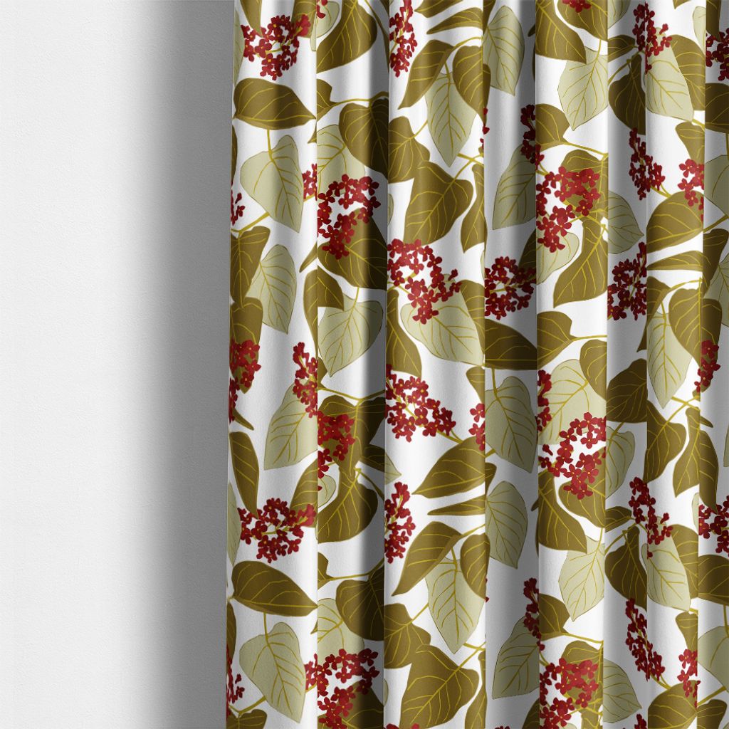 Vid fikabordet röd är ett mönstrat tyg med mjuka blad och röda bär i ett harmoniskt, nordiskt uttryck. Ett livfullt men balanserat mönster som passar lika fint till gardiner som till dukar och andra inredningsdetaljer.