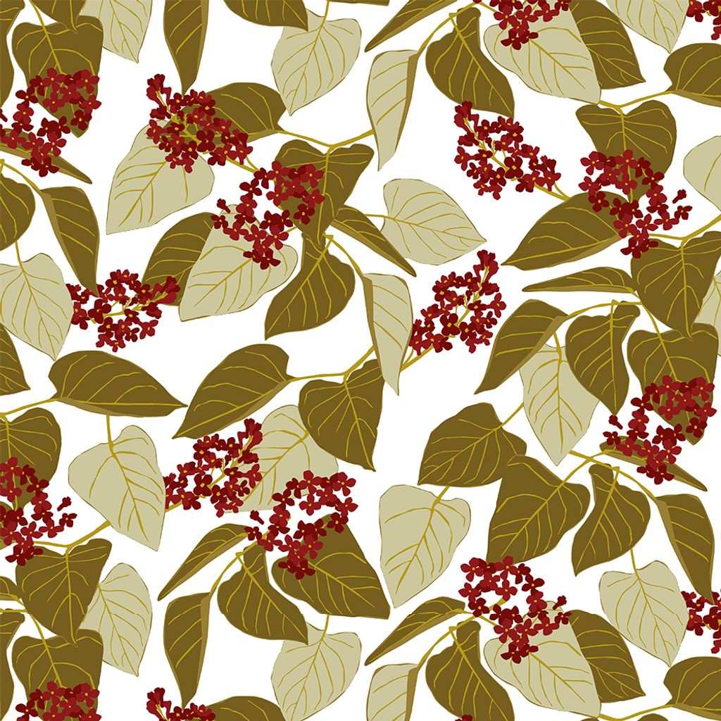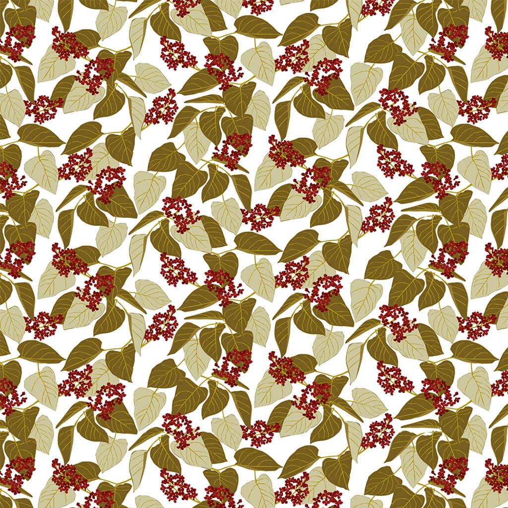 Vid fikabordet röd är ett dekorativt tyg med ett organiskt mönster inspirerat av naturens former och färger. De olivgröna och beige bladen samspelar med små röda bär och skapar ett uttryck som känns både hemtrevligt och tidlöst. Mönstret har ett levande men lugnt tempo, vilket gör att tyget fungerar väl i både större och mindre ytor.