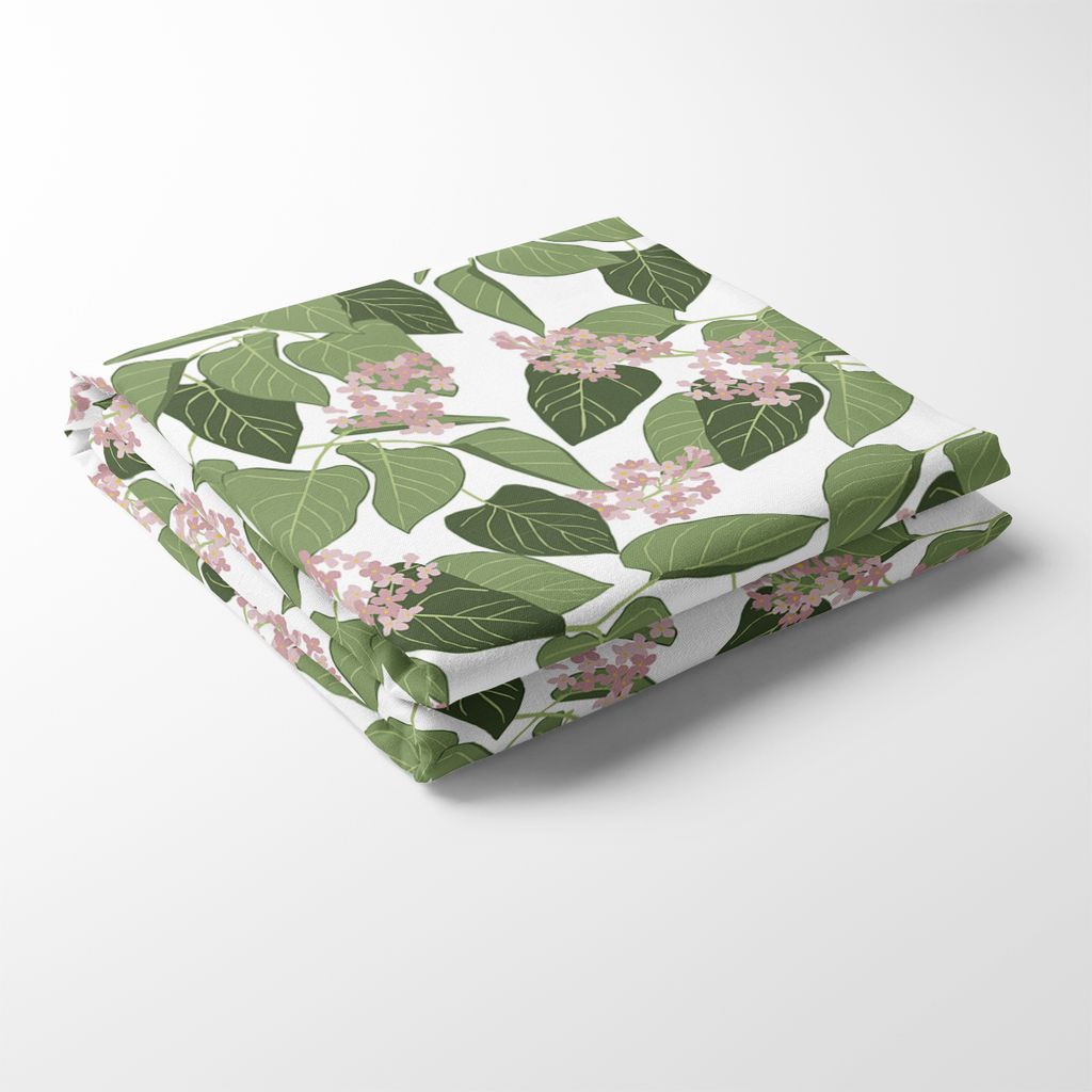 Bordsduk med vit botten med blommor och blad i grönt och rosa.