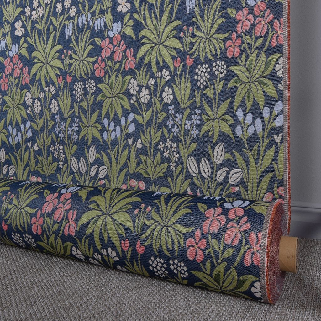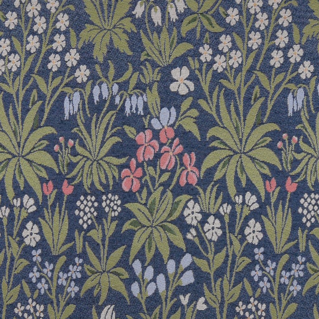 Vildflora Blå är ett tätt mönstrat gobelängtyg som för tankarna till en blommande sommaräng i klassisk, tidlös stil. Blommor i vitt, lavendel, rosa och grönska breder ut sig över en djupt blå botten.