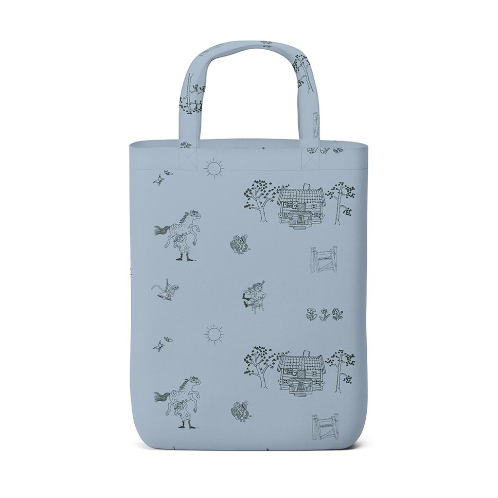 Denna blå tygkasse från Arvidssons Textil är dekorerad med motiv från Villa Villekulla, huset där Pippi bor. Trycket är diskret men lekfullt – perfekt för dig som gillar subtila illustrationer med personlighet. Passar för biblioteket, shoppingen eller barnens packning.