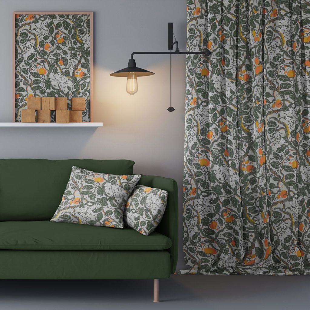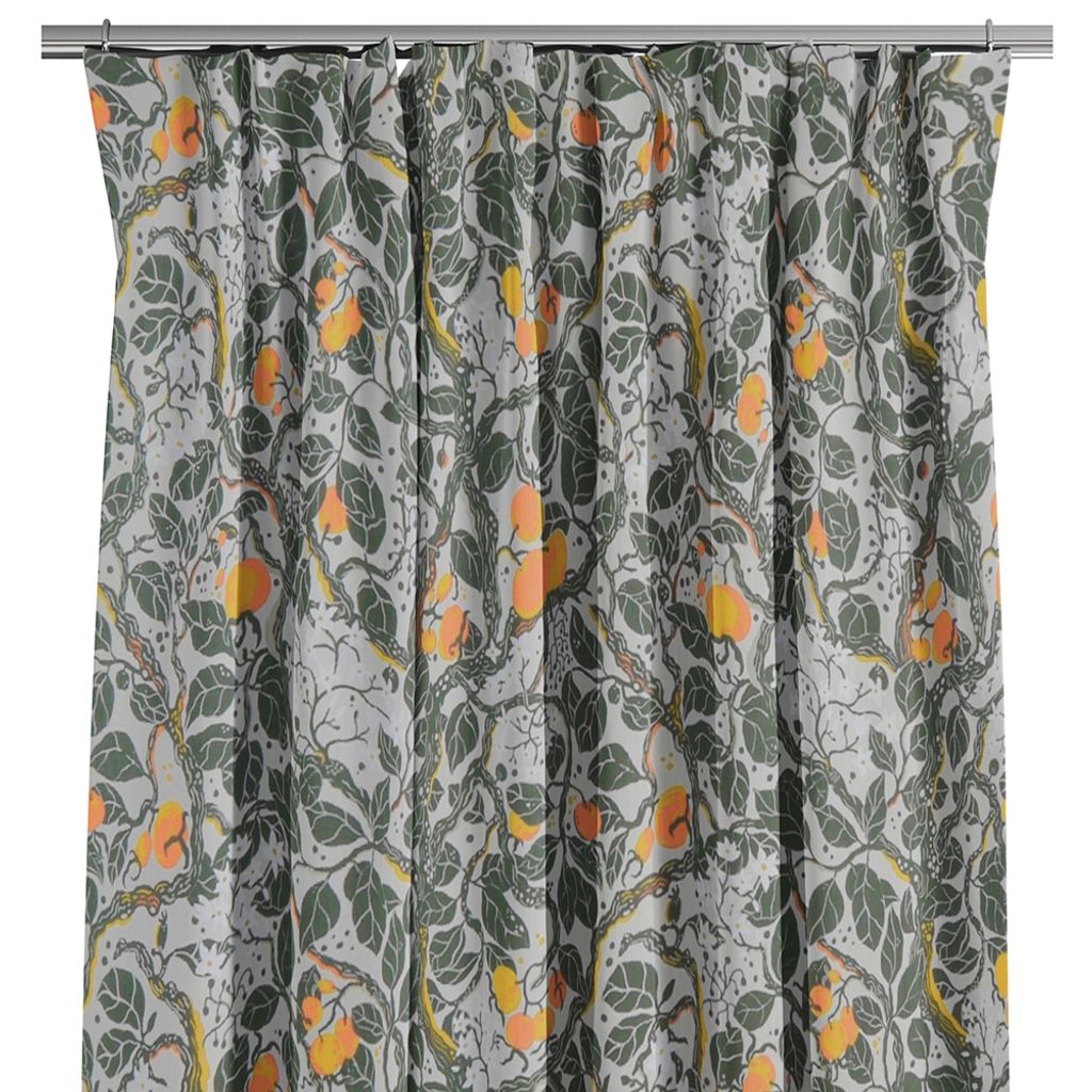 Vindla grön gardiner är inspirerat av brokiga jordgubbsodlingar och tiden mellan när allt står i full blom och då växterna ger efter och släpper sina fröer med vinden från Spira of Sweden.