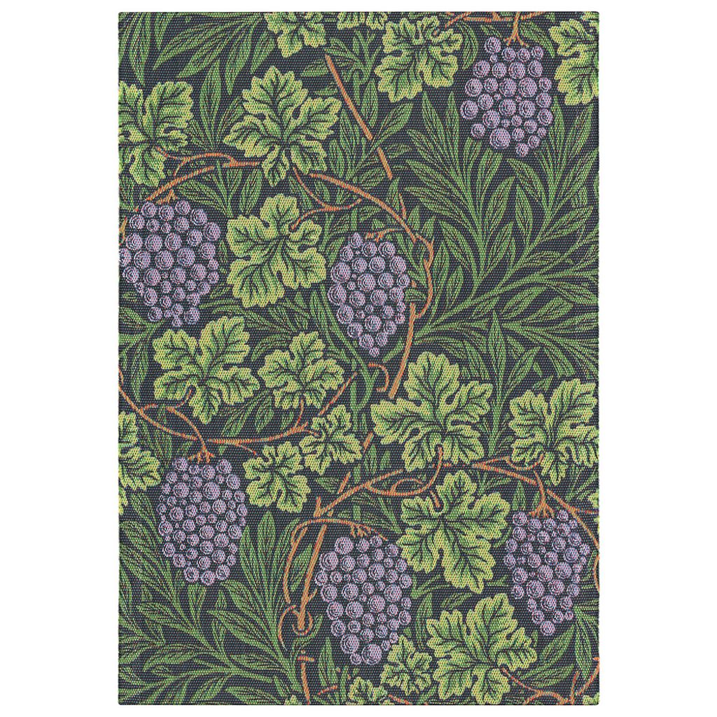 Denna kökshandduk är dekorerad med ett klassiskt mönster av William Morris, druvklasar och gröna bladverk på en djupgröna bakgrunden betonar de lila druvornas detaljrikedom.