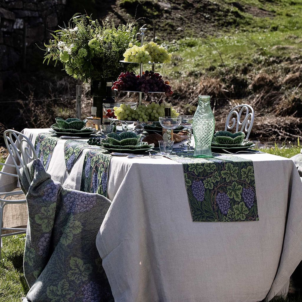 Vine löpare är dekorerad med ett klassiskt mönster av William Morris, druvklasar och gröna bladverk på en djupgröna bakgrunden betonar de lila druvornas detaljrikedom. Duken är framtagen av Ekelunds i samarbete med © The William Morris Society, tillverkad i Sverige av ekologisk bomull, GOTS-certifierad.