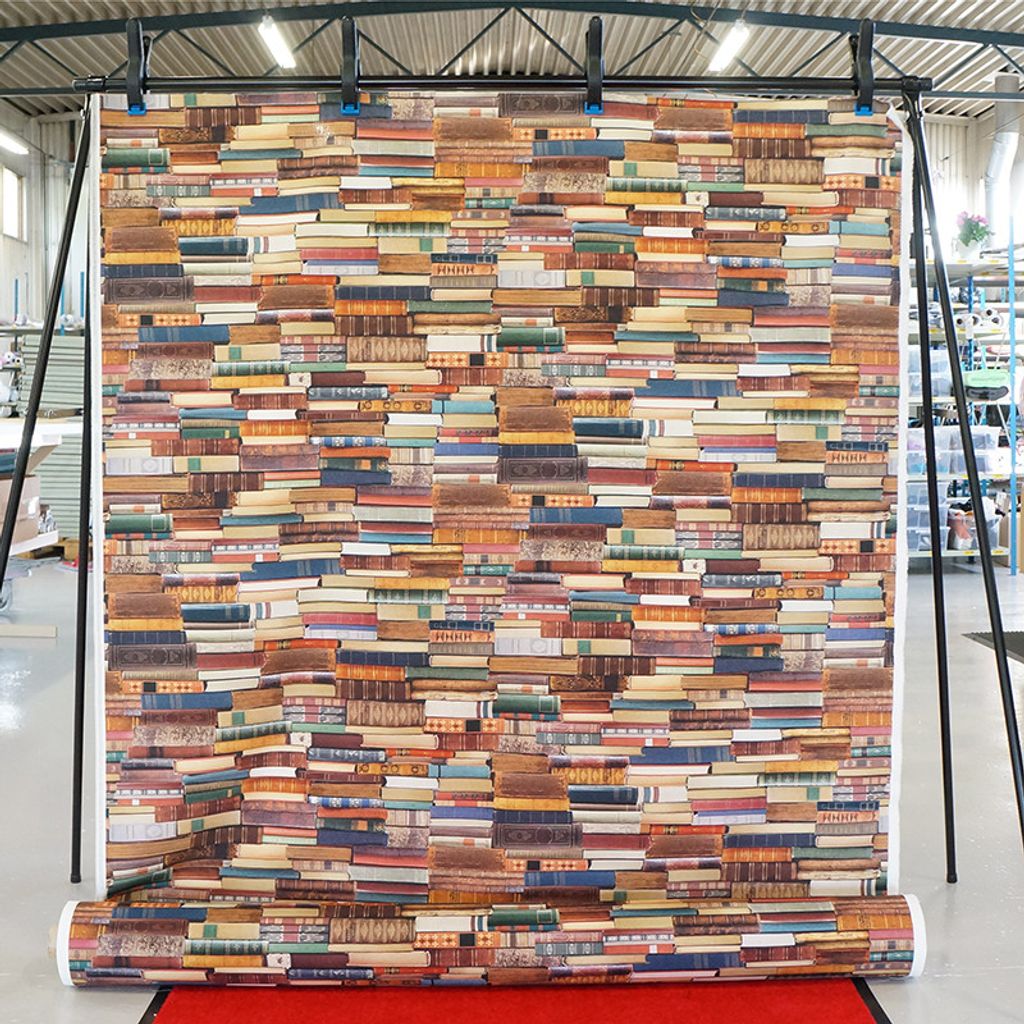 Gardin och inredningstyg med digitaltryckt motiv av böcker.