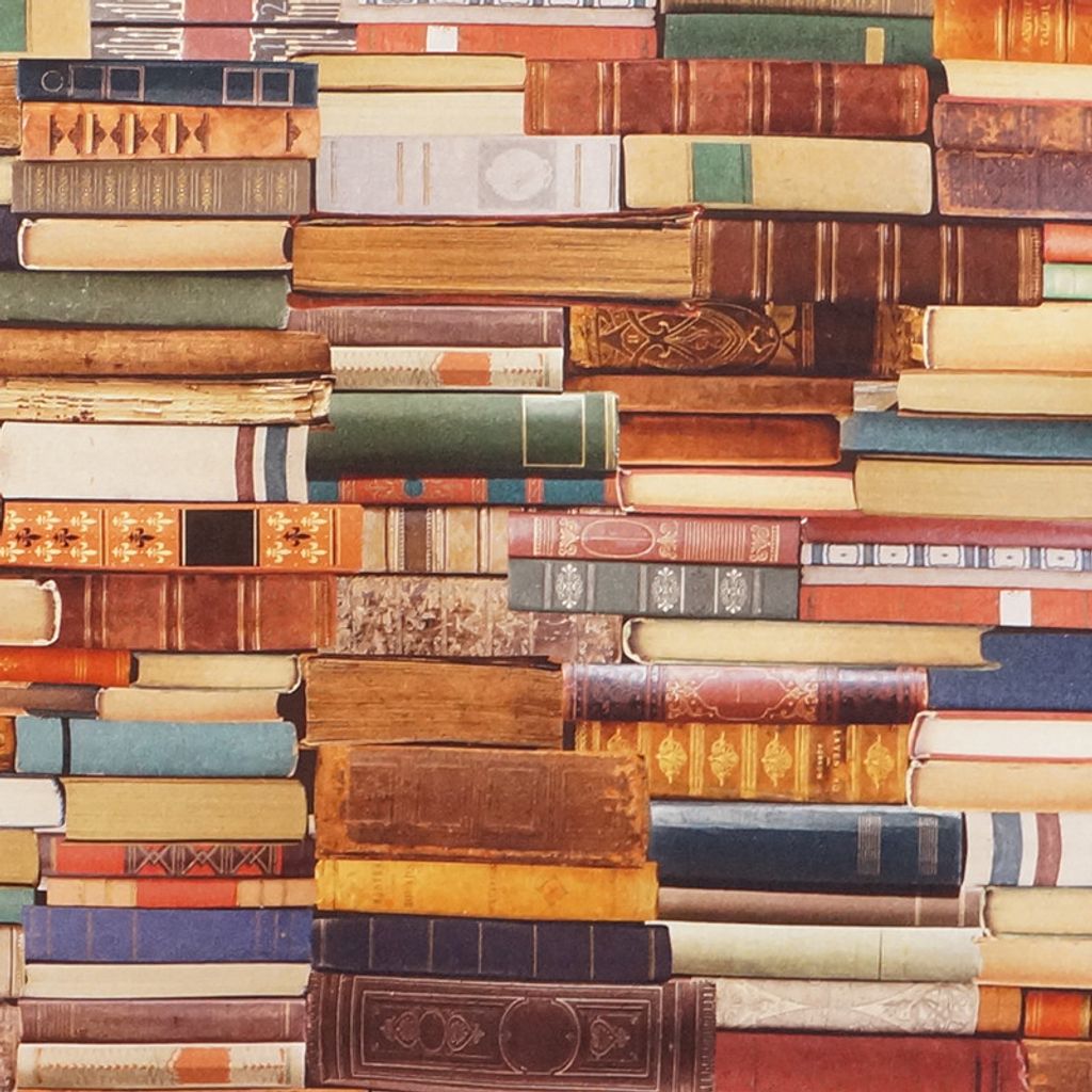 Digitaltryckt inredning och gardintyg med motiv av böcker på hög för sömnad av gardiner, kuddar, dukar m.m.