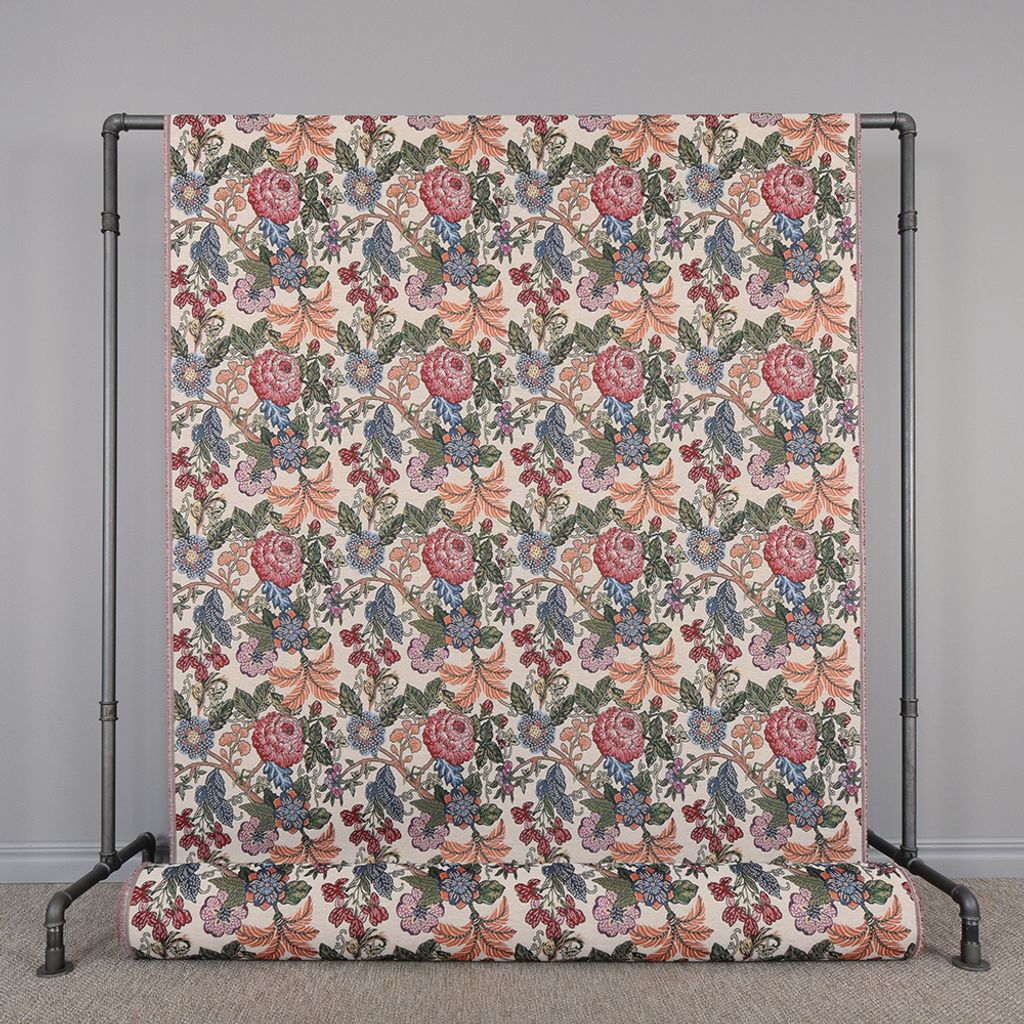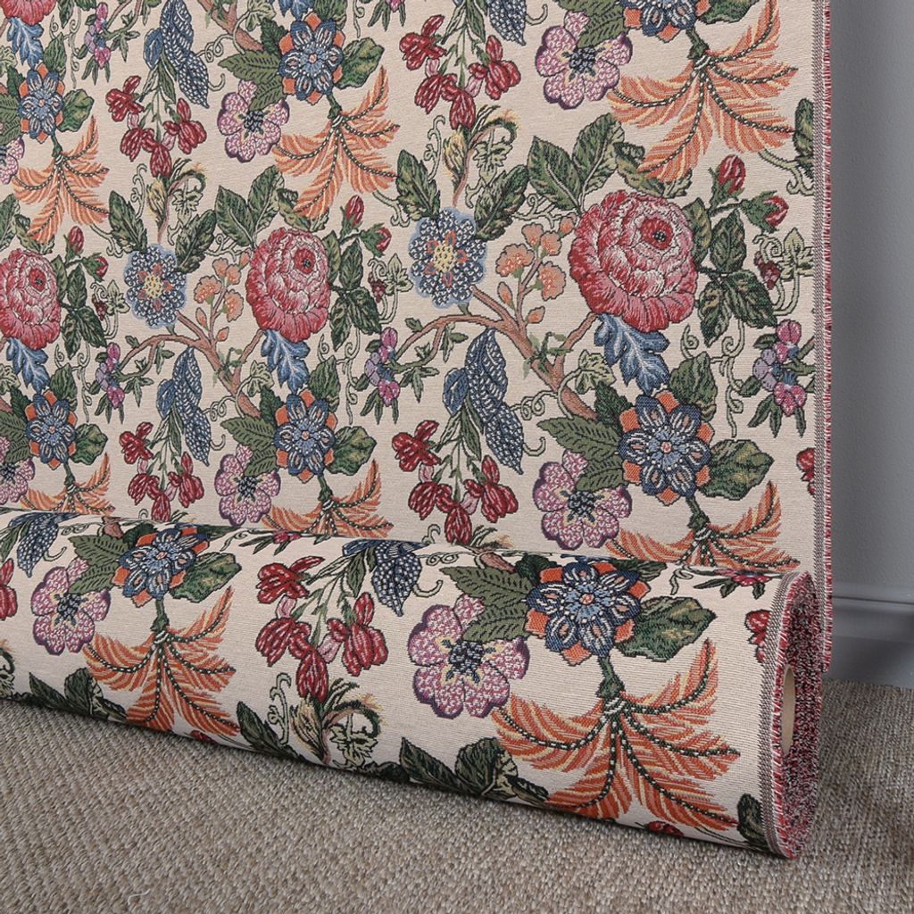 Vintage Flora är ett kraftigt gobelängtyg med färgstarkt blommönster i klassisk stil. Perfekt för möbler, kuddar, gardiner och väggtextil.