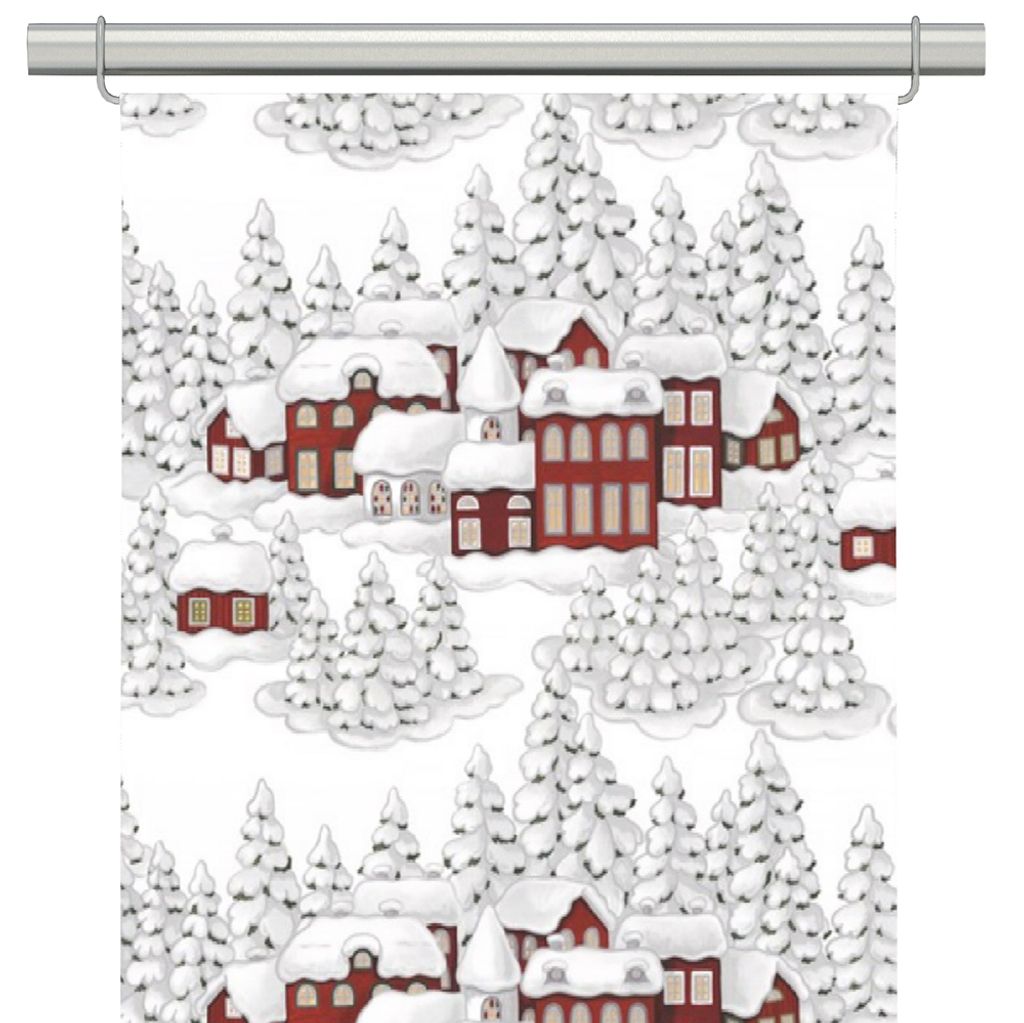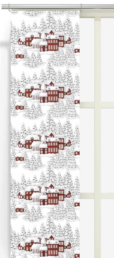 Vit panelgardin med söta röda hus i ett vinterlandskap från Arvidssons textil. Ofållad nederkant med overlocksöm.