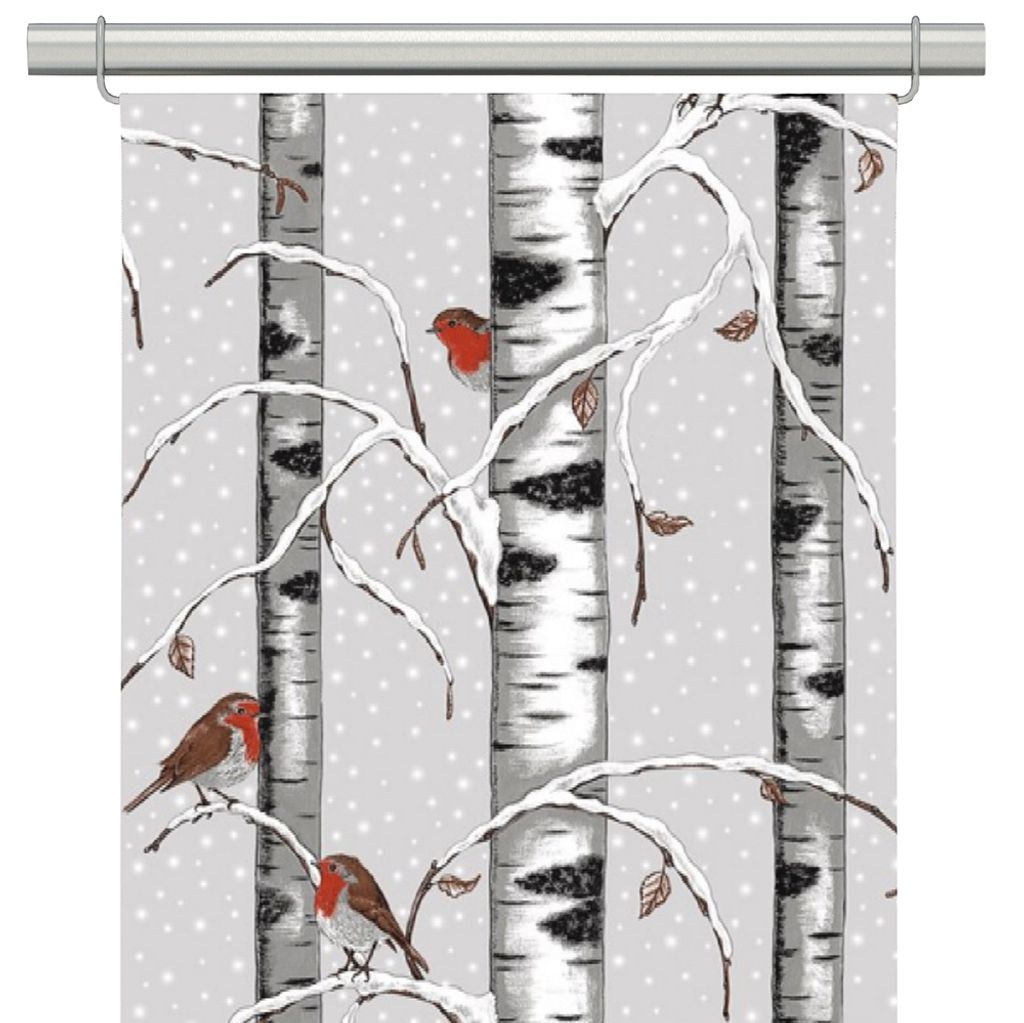 Grå panelgardin med söta fåglar och björkstammar från Arvidssons textil. Ofållad nederkant med overlocksöm.