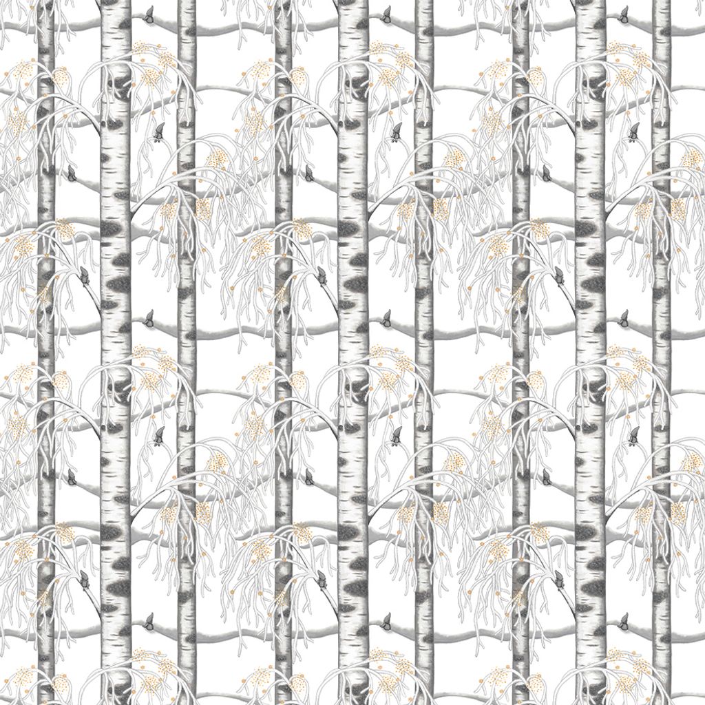 Vinterskrud fångar den fridfulla skönheten i en vinterskog. Mönstret visar slanka björkstammar i subtila gråtoner, med grenar täckta av frost och mjuka snöflingor.