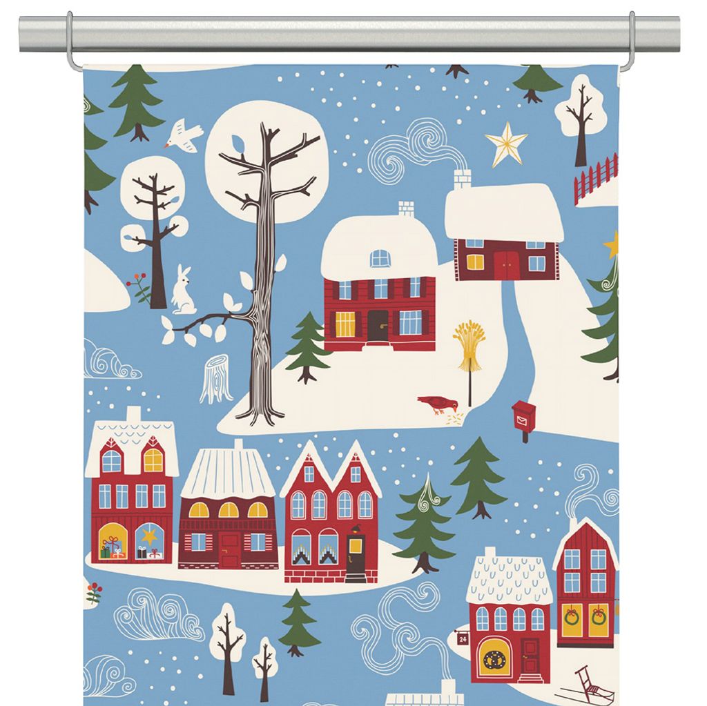 2-pack paneler Vintertid har en magisk vinterscen små röda hus, snötäckta landskap och gröna granar, allt mot en ljusblå bakgrund. Panelerna är vita på baksidan.