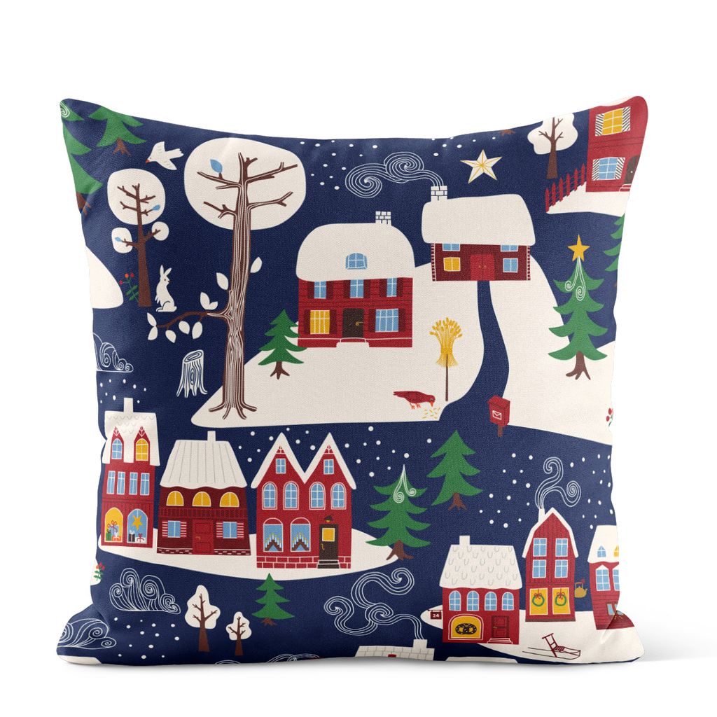 Vintertid mörkblå kuddfodral fångar essensen av den skandinaviska vintern, med ett härligt motiv av snötäckta hus, granar och vinterlandskap på en stämningsfull mörkblå bakgrund. Detta kuddfodral är perfekt för att tillföra en varm och inbjudande känsla i hemmet under de kalla månaderna. Dess detaljerade och färgglada design gör det till en härlig dekoration i soffan, fåtöljen eller sängen. Matcha gärna med andra vinterinspirerade textilier för en komplett och ombonad inredning.