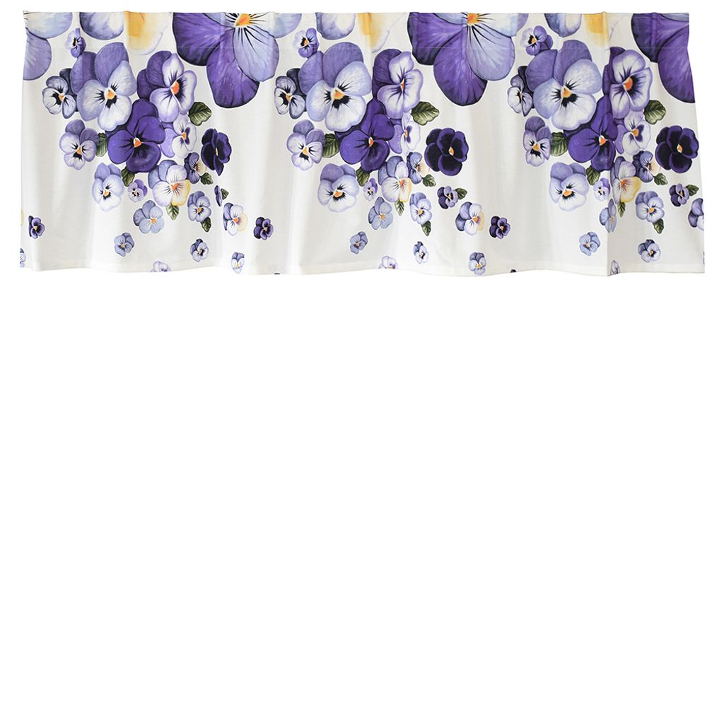 Gardinkappa på metervara med veckband och ofållade sidor. Offwhite botten med violer i blått och lila