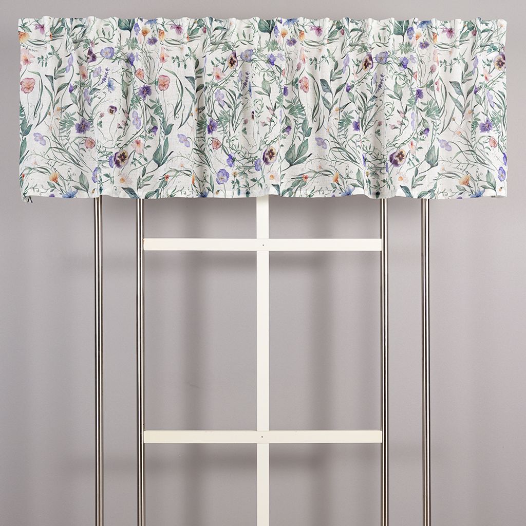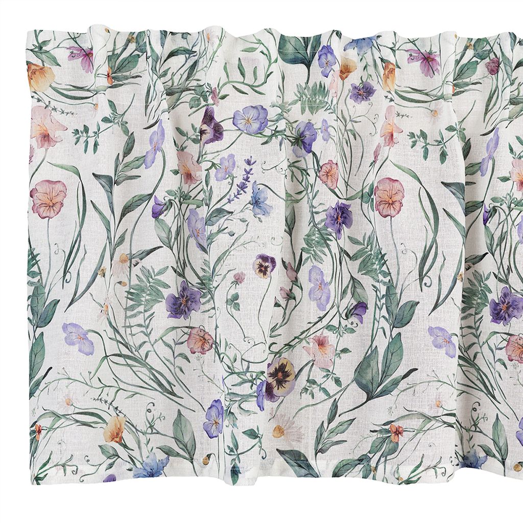 Viola offwhite gardinkappa är en hyllning till sommaren – ett skirt och vackert inslag vid fönstret som släpper in ljuset på ett mjukt sätt och skapar ett harmoniskt rum. Det florala mönstret består av målade violer och vilda blommor i nyanser av lila, aprikos, grönt och gult som slingrar sig lekfullt över en ljus botten.