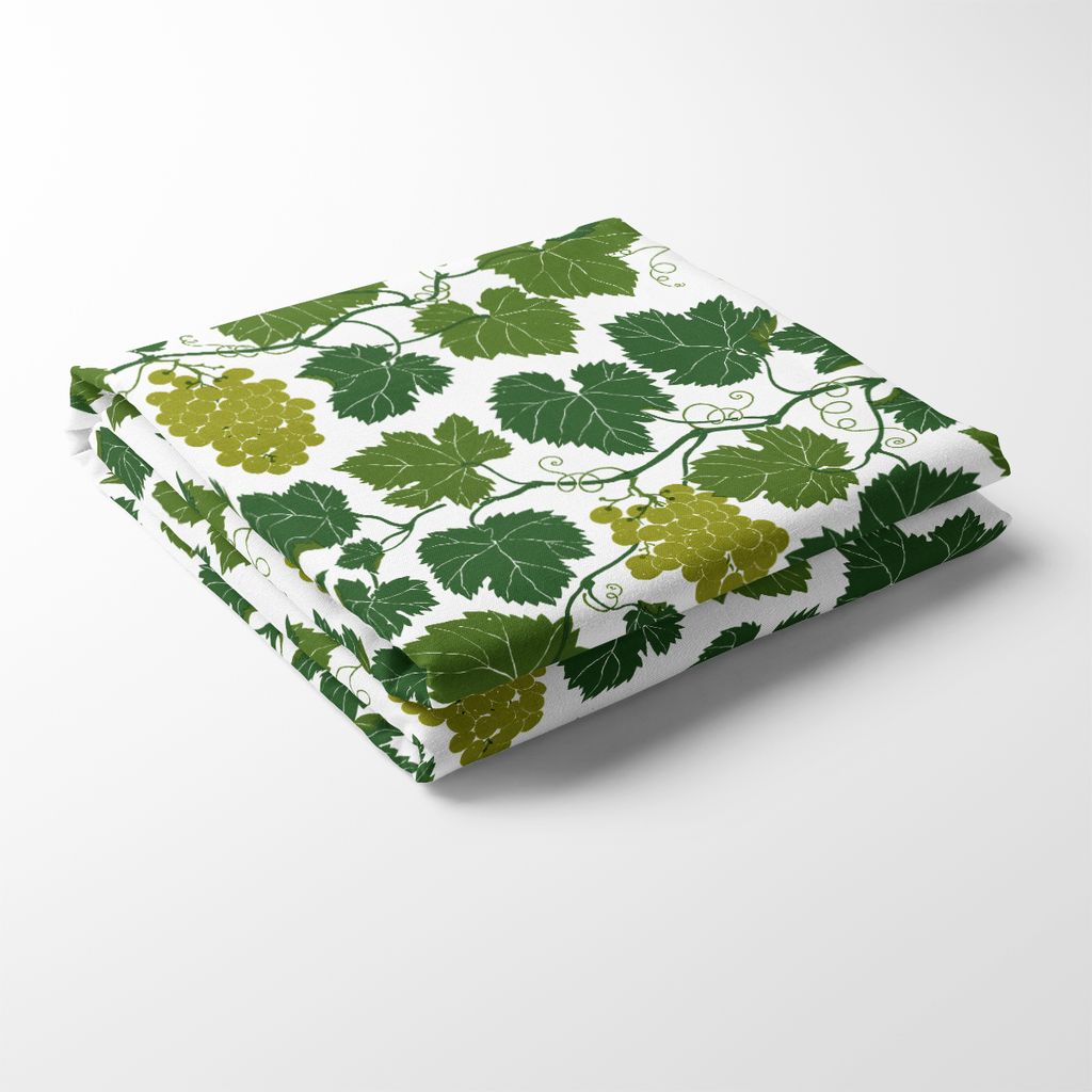 Bordsduk Vitis vinifera med gröna vinblad och saftiga druvor som slingrar sig över en ljus bakgrund, vilket ger en fräsch och naturlig känsla.