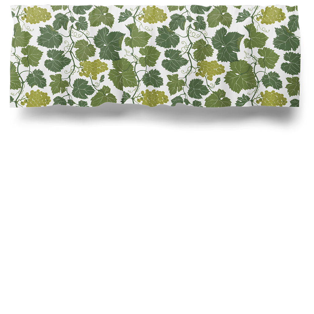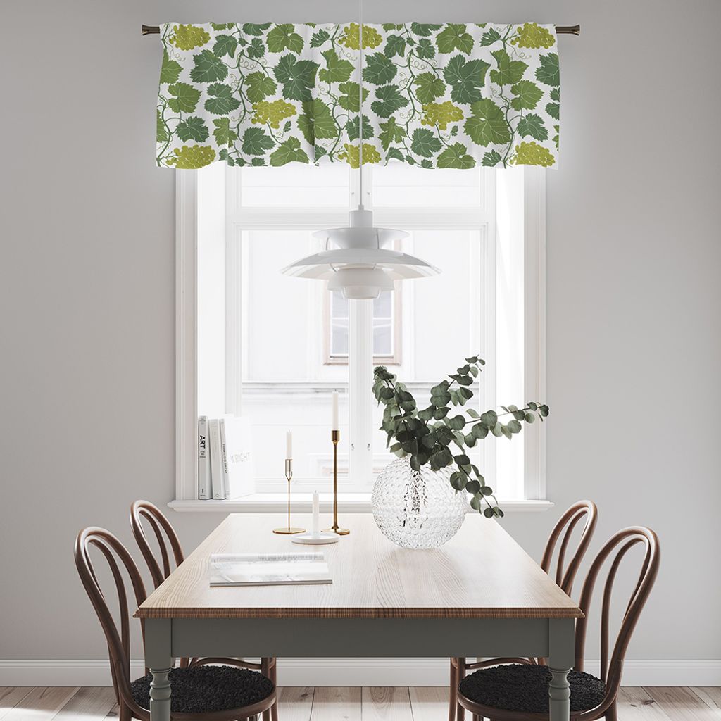 Gardinkappa på metervara med multiband och ofållade sidor. Tyget Vitis vinifera har ett mönster av gröna vinblad och klasar med saftiga druvor som slingrar sig över en ljus bakgrund. Kappan är 55cm hög.