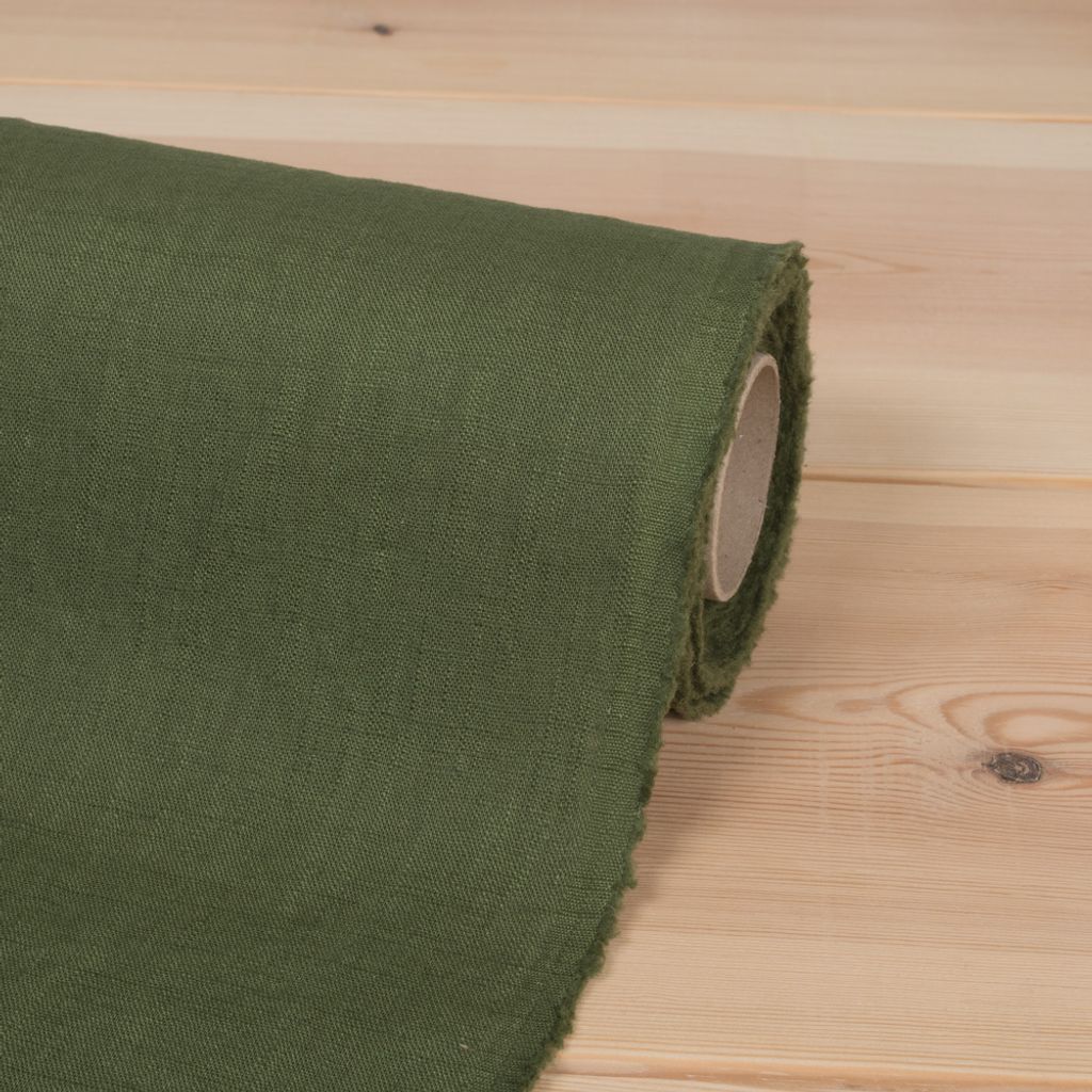 Tvättat lin och bomulls tyg i grönt som passar både till gardiner, hemtextil och kläder. Oeko-tex