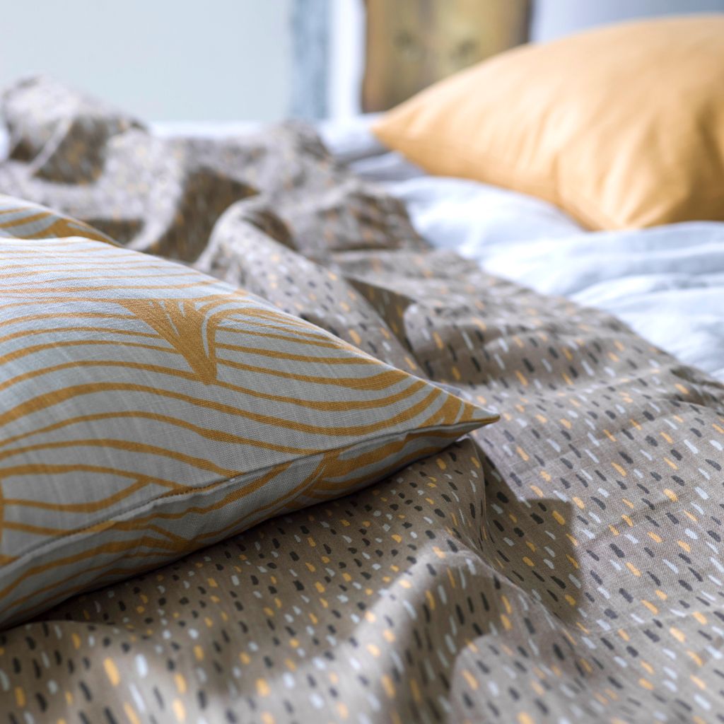 Wave honung kuddfodral är en hyllning till naturens rörelse och form, tolkad genom skandinavisk minimalism. Det svepande mönstret för tankarna till mjuka vågor eller virvlande blad, och skapar en dynamik som samtidigt känns harmonisk. Den gyllengula honungsfärgen värmer upp rummet och blir ett livfullt inslag i såväl moderna som klassiska hem.